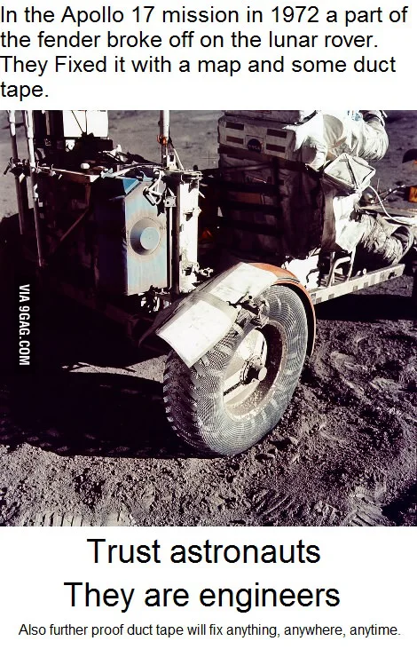 Миссия Аполлон-17. Это была уже не первая высадка на Луну, и астронавтами использовался лунный автомобиль, который, однако, эти Шумахеры ухитрились повредить - сломали задний протектор. На Земле это было бы совершенно незначительное событие, но на Луне взметаемая пыль (а её там много) толстыми слоями оседала на скафандрах, ровере, корабле, в общем, надо было что-то делать. Вот они и сделали (см. картинку выше). К слову, для проверки возможности такого ремонта в NASA даже нарядили в скафандры запасную группу и заставили потренироваться, прежде чем дали ответ. В качестве материала использовалась лента и алюминиевые карты места высадки (не пропадать же добру).