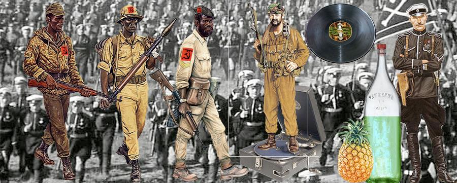 Поручик Сергей Апполинарьевич Тульчин махнул стопку самогонки и скривясь закусил ломтиком ананаса. Самогонка у него была отличная, благо процесс изготовления и тюнинг аппарата, длились не один десяток лет, а вот соленые огурчики кончились, а новая закладка еще не была готова. Поручик, пройдя в 1920 году, Великий Сибирский Ледяной поход, 3000 верст смерти, от Барнаула до Читы, стал фаталистом и абсолютно перестал бояться смерти. Он знал, что умер на Байкальском льду от тифа, все что было дальше, это просто предсмертный морок. Именно это подсознательное убеждение, помогло ему убить трех хунхузов, которым обкурившаяся опия проститутка, сказала, что этот капитана (всех русских офицеров китайцы называли капитанами) везет золото. Золото искал атаман хунхузов, так как он хотел выкупить пулеметы у американского шкипера, а тот брал только золото, а своего золота у атамана не хватало, все это рассказал при экспресс-допросе, последний из нападающих. В результате золото хунхузов досталось поручику, ибо атаман и четыре охранника, для человека прошедшего ад Гражданской войны в Сибири, это было не серьезно. Потом, на борту корабля того самого шкипера, поручик начал свой кругосветный анабазис, приведший его сначала в Боливию, откуда он после Чакской войны перебрался в Африку, где и осел на многие годы. Он купил кораль, а после того как Тульчин спас от эпидемии соседнее племя (всего то ужесточив правила гигиены и устроив карантин для больных), его на полном серьезе выбрали вождем, и это признали даже французы, которые тогда там хозяйничали. Жизнь вроде бы вошла в колею, из племени ему все время поставляли молодых жен, которые смотрели за хозяйством, но каждые два-три месяца, поручику снилась Гражданская война, после чего он ударялся в трехдневный запой. На территории племени не было полезных ископаемых, зато рос редкий вид Акоканетры, из сока которой туземцы делали страшный яд, которым смазывали стрелки, своих духовых трубок. Так что соседи уважали это племя настолько, что кабачок, который поручик приказал построить на шоссе, проходящем по краю племенных земель, считался официально нейтральным местом, которое нельзя грабить, и где нельзя убивать друг-друга. Только один раз данное статус-кво нарушила некая мутная группа из "Корпуса Мира", они затеяли конфликт с посетителями и прострелили ногу одному из них. Через пару дней их (вернее то, что от них осталось), нашли в джунглях около потухшего костра. Больше прецедентов не было. Именно на веранде этого кабачка убеленный сединами ветеран 3й армии Каппеля, находился в данный момент. Абстиненция благостно прекратилась и перешла в небольшую нирвану, и поручику вспомнилась сцена из большевистского фильма "Чапаев", копии которого весьма живо гуляли по Африке. Там каппелевский полк шел парадным шагом в атаку. Бред конечно все это, тем более, причем тут чехи, но как же красиво шли офицеры, в черных мундирах и фуражках с белым верхом. И в ушах вдруг зазвучал неофициальный гимн Белой армии - "Вещий Олег". Поручик ностальгически помотал головой, принял еще стопку, но песня, почему то продолжалась и становилась все громче и громче и звуки звучали явно не в голове старого поручика, а со стороны поворота. На шоссе, из-за края зеленки, появилось марширующее подразделение. Судя по оружию, униформе и цвету кожи, это был кто-то из м