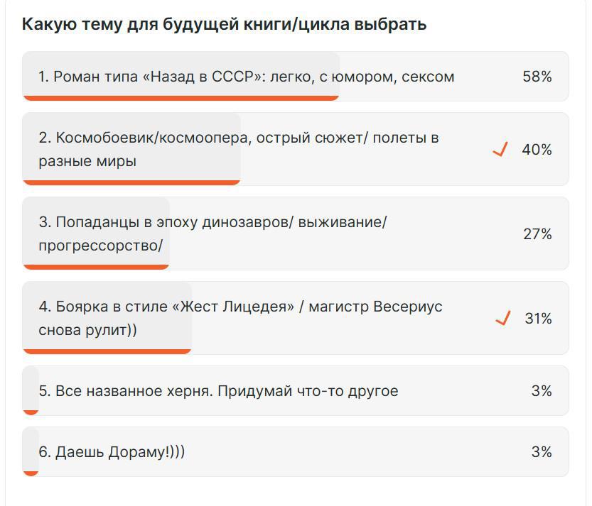 Автор: Эрли МоуриДалеко не все подписаны на мою страничку в Бусти, поэтому решил поделиться частью этого поста здесь. Результат опроса по читательским предпочтениям оказался неожиданным для меня, и будет интересен как читателям, так и авторам.