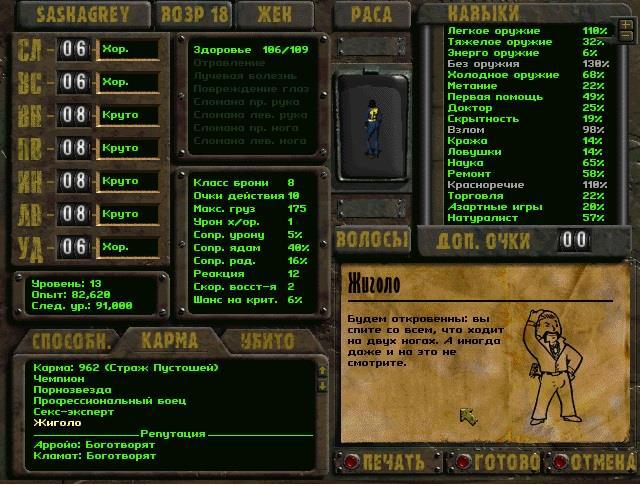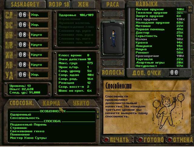спортсменка (рукопашный бой 130), дипломат (красноречие 110), ворошиловский стрелок (легкое оружие 110) Избранная и просто красавица (сексапильность, харизма 7 родная и 8 с модными очками)! Доступны все ачивки мужского персонажа от "чемпиона по боксу" до "жиголо"