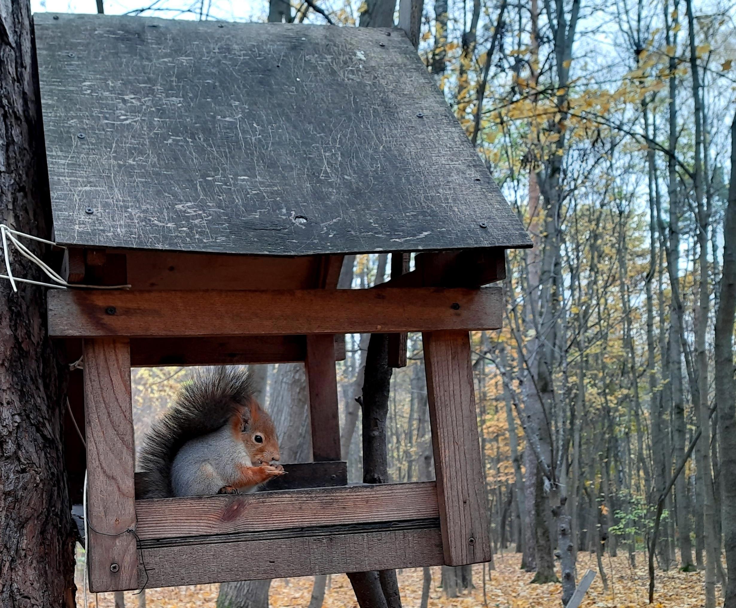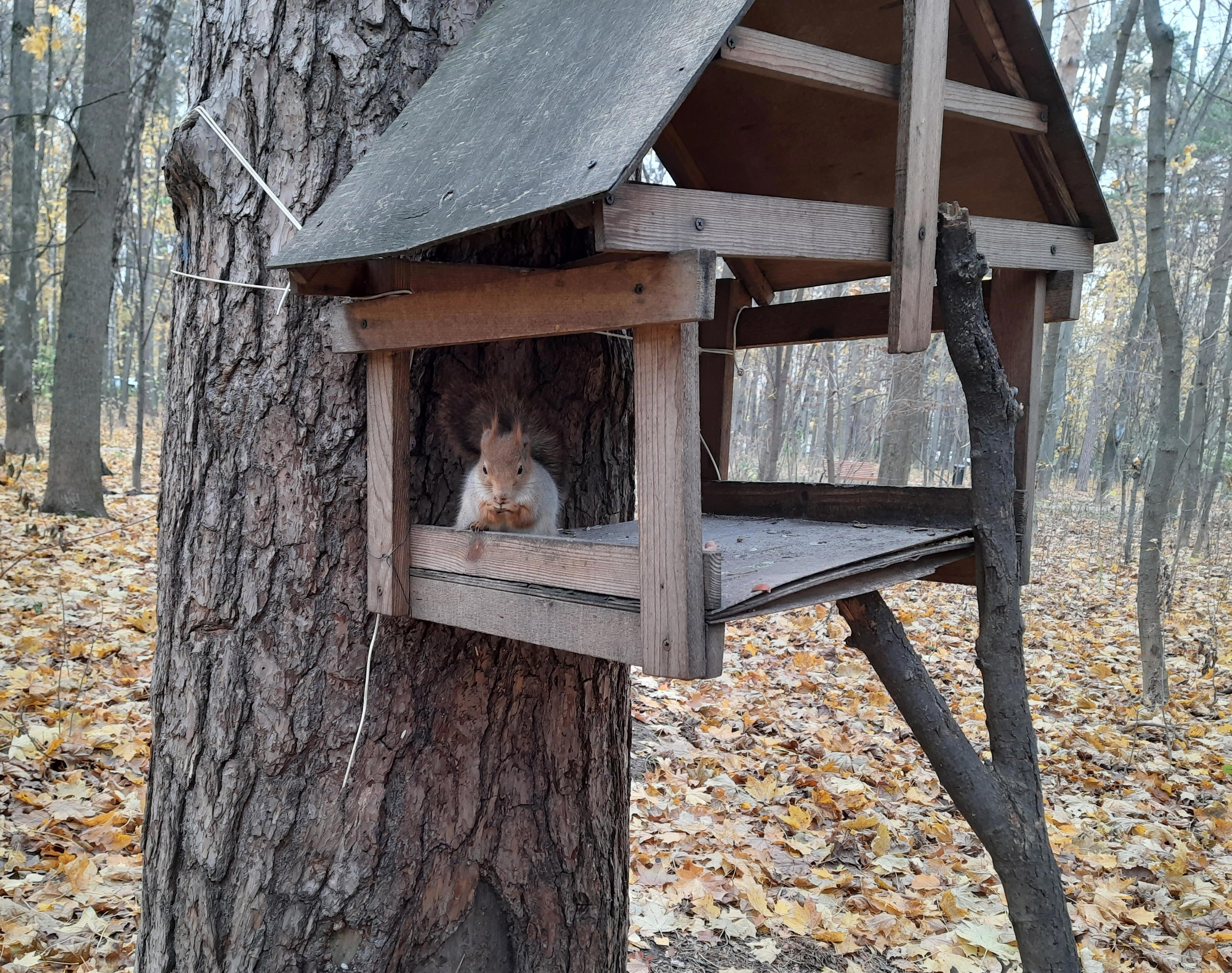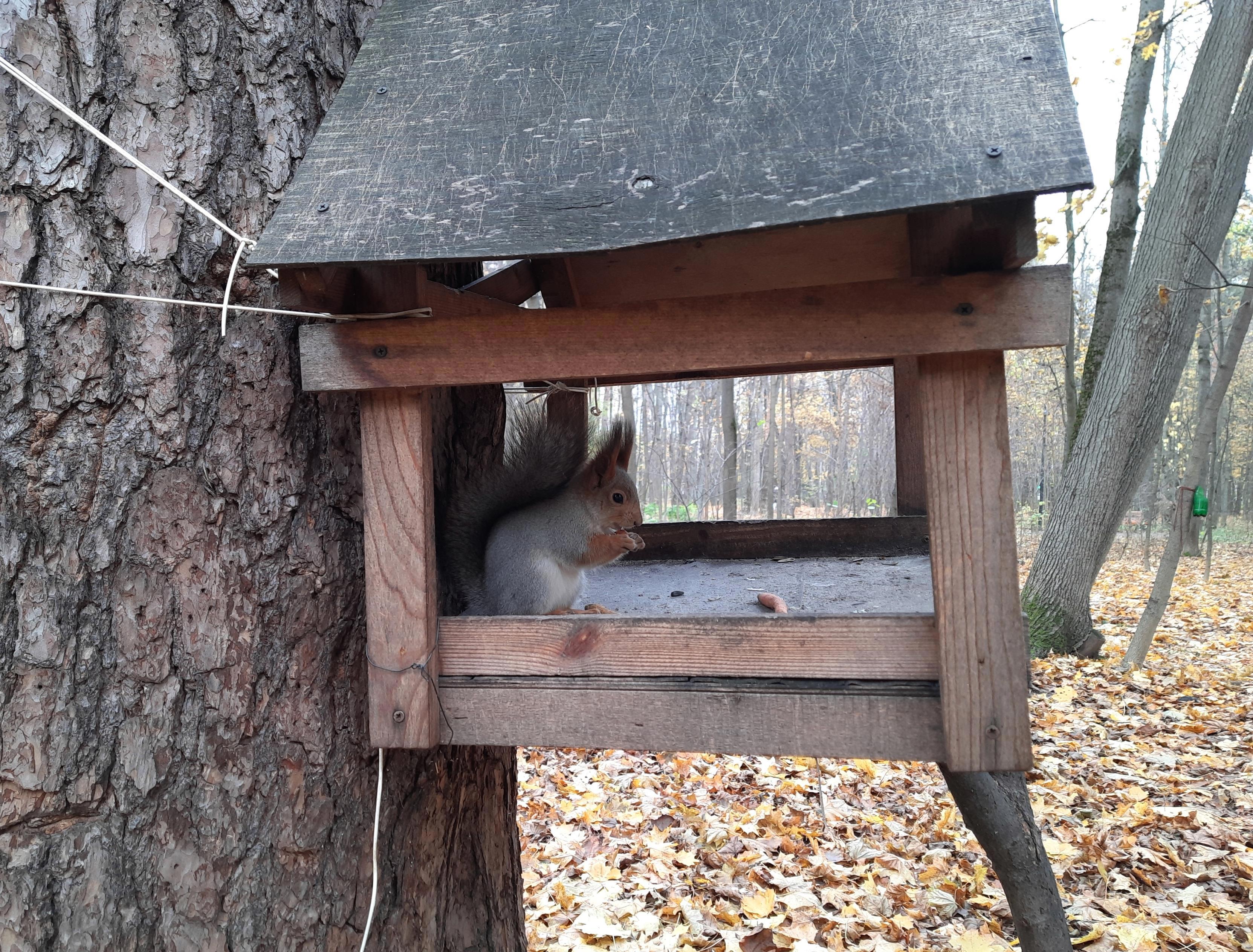 Кормушек в парке много. Зверьки к ним регулярно наведываются. Кроме белок, маленькие столовые посещают птицы, а иногда и мыши.