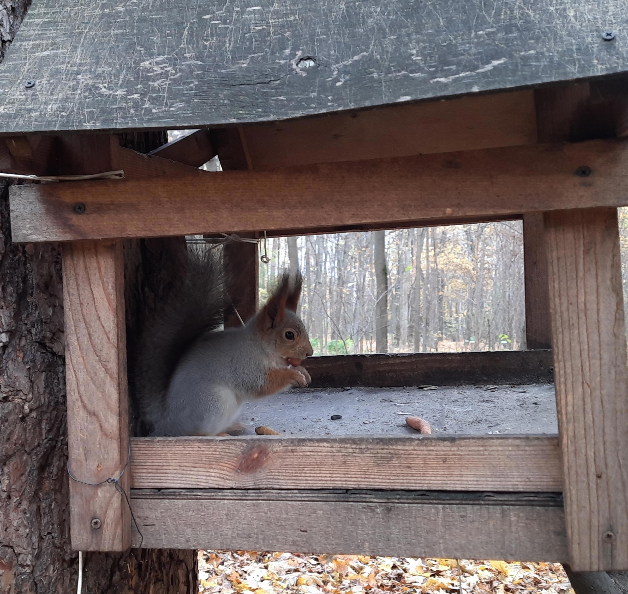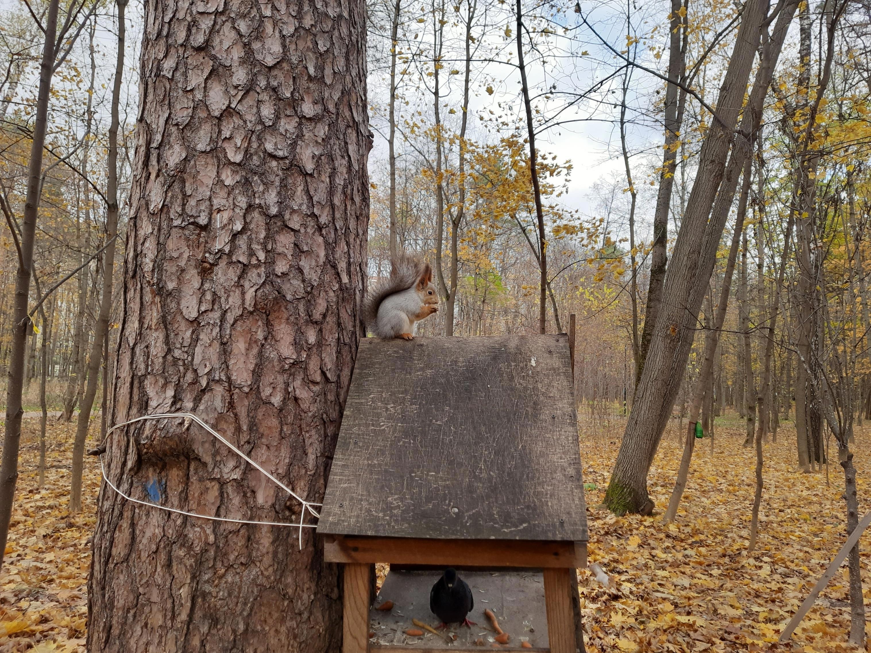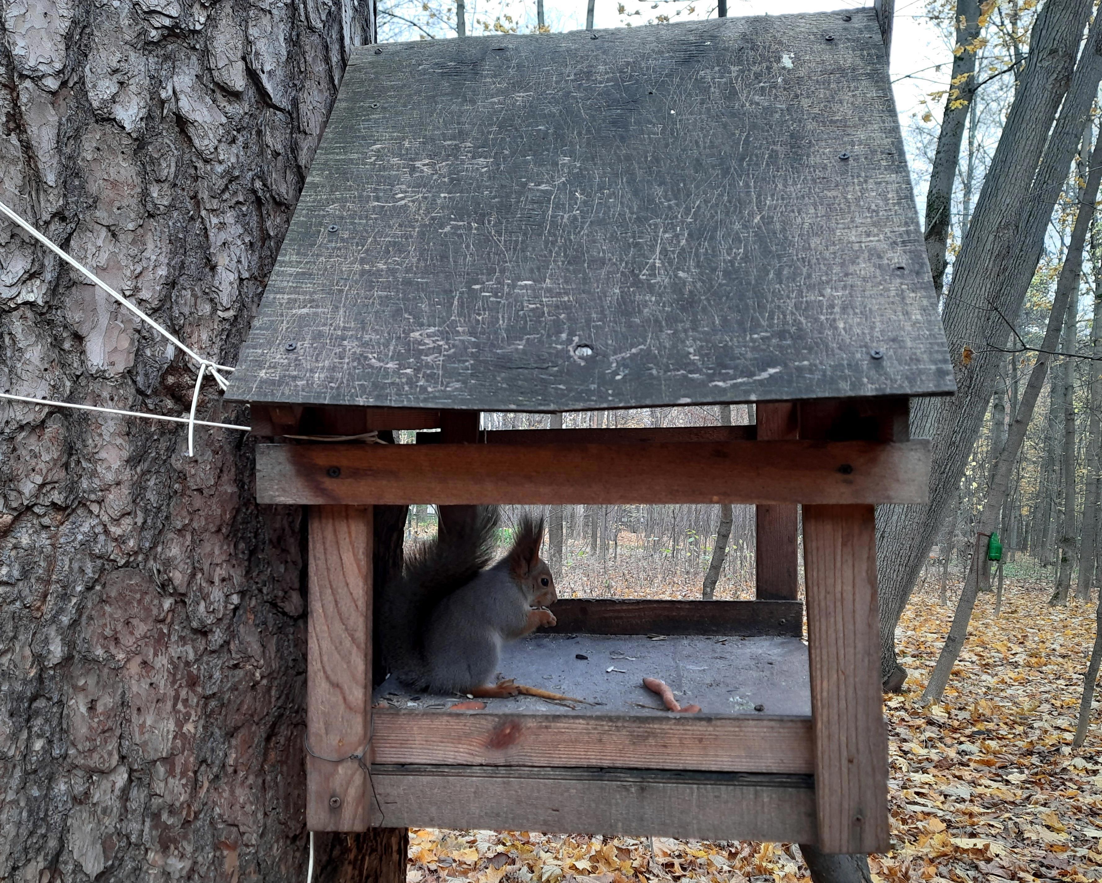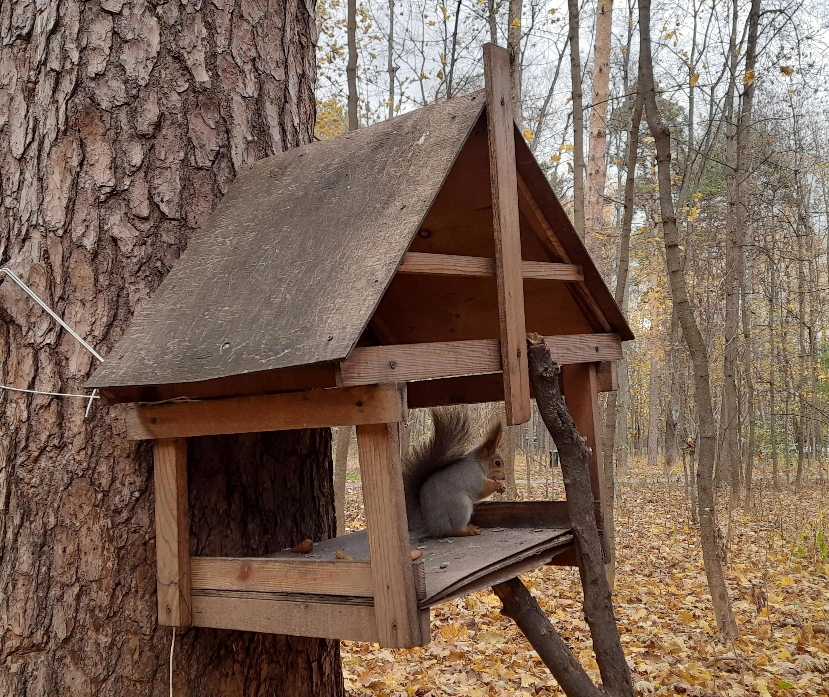Кормушек в парке много. Зверьки к ним регулярно наведываются. Кроме белок, маленькие столовые посещают птицы, а иногда и мыши.