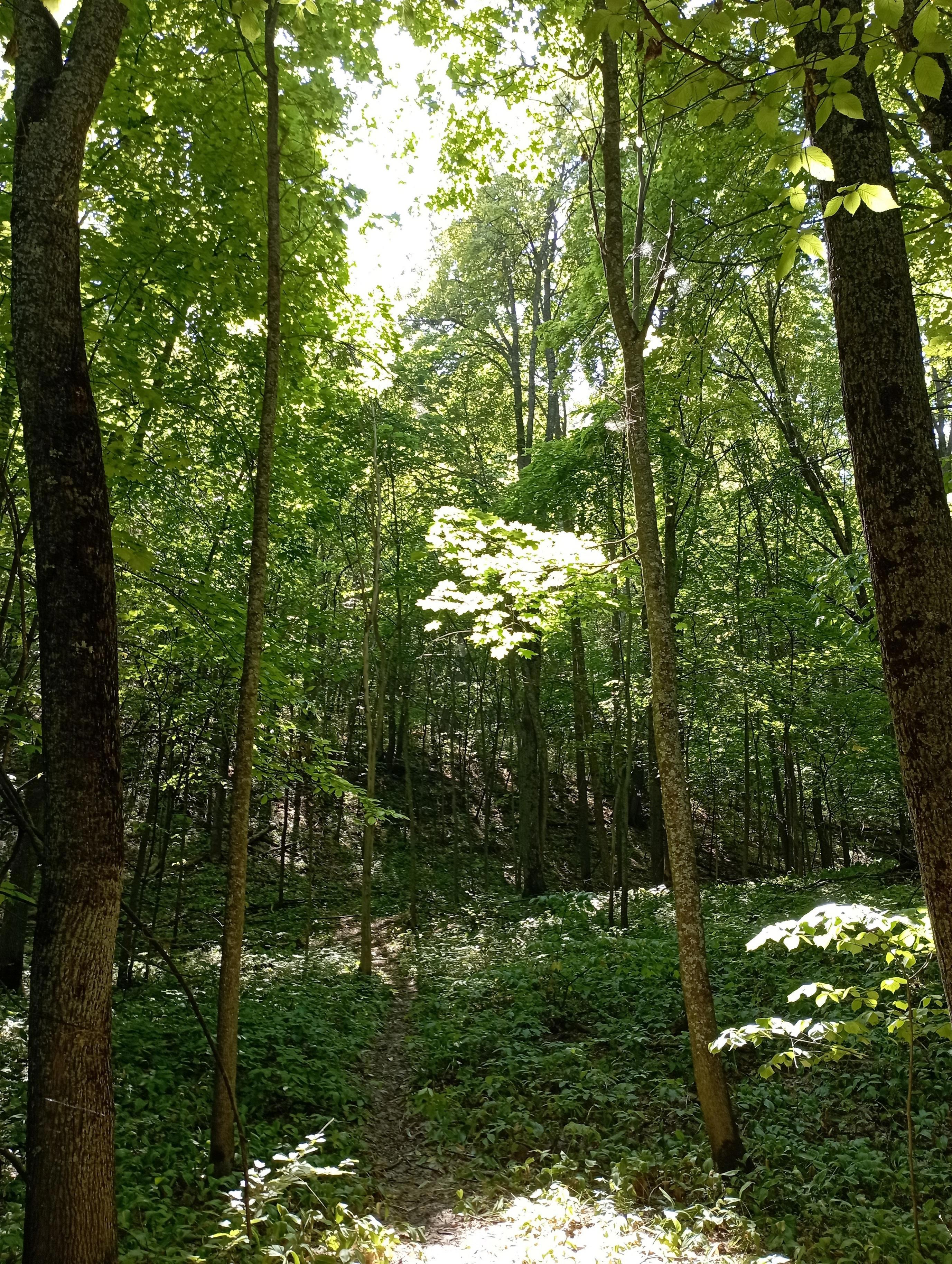 Обойдя дачу и проломившись через бурьян, мы таки вышли на хорошую тропу. И вот тут всё стало гораздо лучше. Неприятное впечатление от начала тропы выправилось. И лес наконец стал лесом и раскрылся в полной мере. Красивый смешанный лес, где вперемешку растут дубы и реликтовые меловые сосны, где пахнет смолой и травой. И очень тихо, непривычно тихо, и эта тишина звенит в ушах, и к ней прислушиваешься, как к музыке. Шелест листьев и травы, голоса птичек, полёт букашек — всё вплетается в лесную незатейливую мелодию. Надо только сесть и слушать.