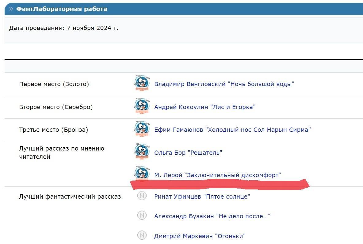 Мой рассказ "Заключительный дискомфорт" вышел в финал ФЛР-27, и стал лучшим по мнению читателей.