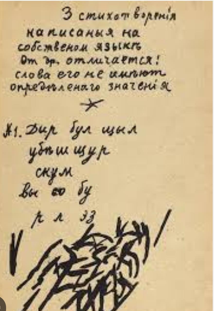 Футуристы стремились утвердить новые правила поэзии любым способом. Они экспериментировали с ритмикой и рифмой, устраивали эпатажные выступления. Все мы помним воспоминания Каменского: «...когда вышли мы (Маяковский в желтом распашоне, в цилиндре на затылке, Бурлюк— в сюртуке и желтом жилете, с расписным лицом, я— с желтыми нашивками на пиджаке и с нарисованным аэропланом на лбу)... аудитория гремела, шумела, орала, свистала, вставала, садилась, хлопала в ладоши, веселилась». А вот так выглядело известное стихотворение А. Кручёных: