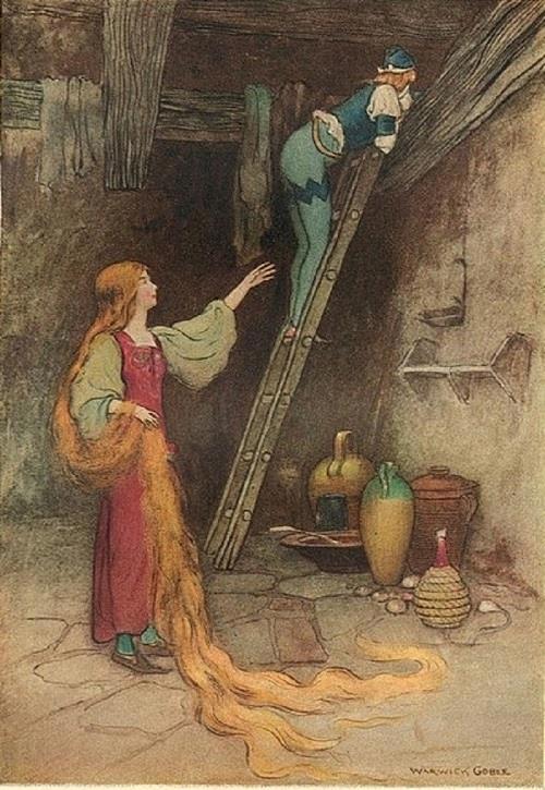 "Когда 20 декабря 1812 года увидел свет их первый сборник сказок, то его тут же обвинили в пропаганде безнравственности. <...> Редактированием сказок Вильгельм занимался весьма осторожно, но кое-что изменить им всё-таки пришлось. Допустим, читатель второго издания уже не мог понять, что же так возмущало однофамильца Гримма в сказке «Рапунцель». Дело в том, что в первом варианте колдунья узнаёт о том, что принц посетил заточенную в башне девушку, не из-за того, что Рапунцель проговорилась («Почему мне тебя тащить наверх тяжелей, чем молодого королевича?»), а потому что пожаловалась на то, что платье стало жать ей в поясе.