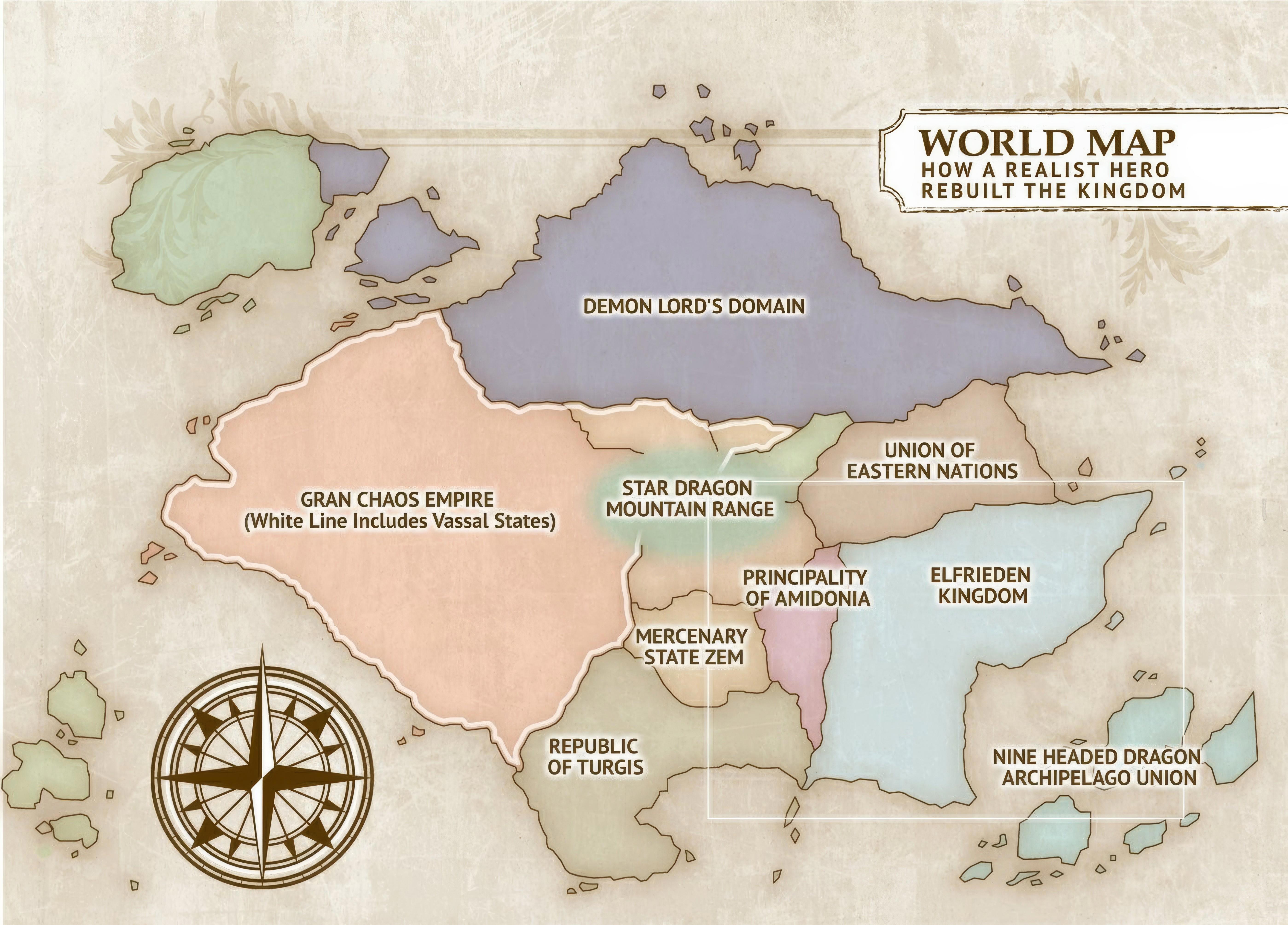В своём посредственном фанфике я пытаюсь задумываться о тех вещах, на которые автор оригинала, по всей видимости, наплевал. Карта мира же его ранобэ, для меня, одна сплошная дурь. Ведь в политическом романе, границы государств, их союзы, интересы краеугольный камень для героя, что решился влезть во всю эту политическую игру. Но мы имеем это. Смотрите сами.