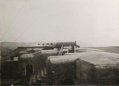 Орудия 15 батареи развёрнуты на обратную директрису - для защиты сухопутного фронта крепости. На переднем плане, перед десятидюймовкой виднеется 57-мм пушка Норденфельта. Фото из экспозиции Артмузея, подпись под: "Бетонные казематы бат. № 15 (орудия повёрнуты назад)".