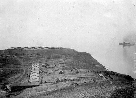 То же место съёмки, чуть крупнее. Батарея "Электрический утёс". На море виден броненосец "Севастополь".