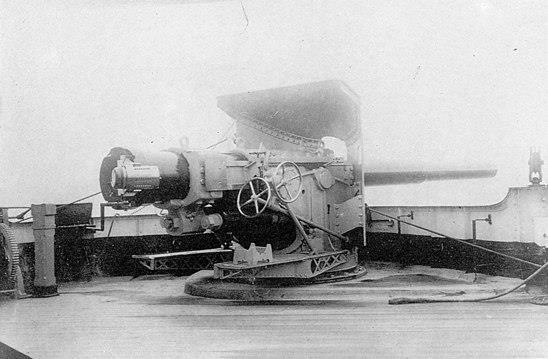 До 1907 года в боекомплекте пушки бронебойные, фугасные и сегментные снаряды весом 87,8 кг и длиной 2,5—2,6 клб. Сегментные снаряды с 45-секундными дистанционными трубками.
