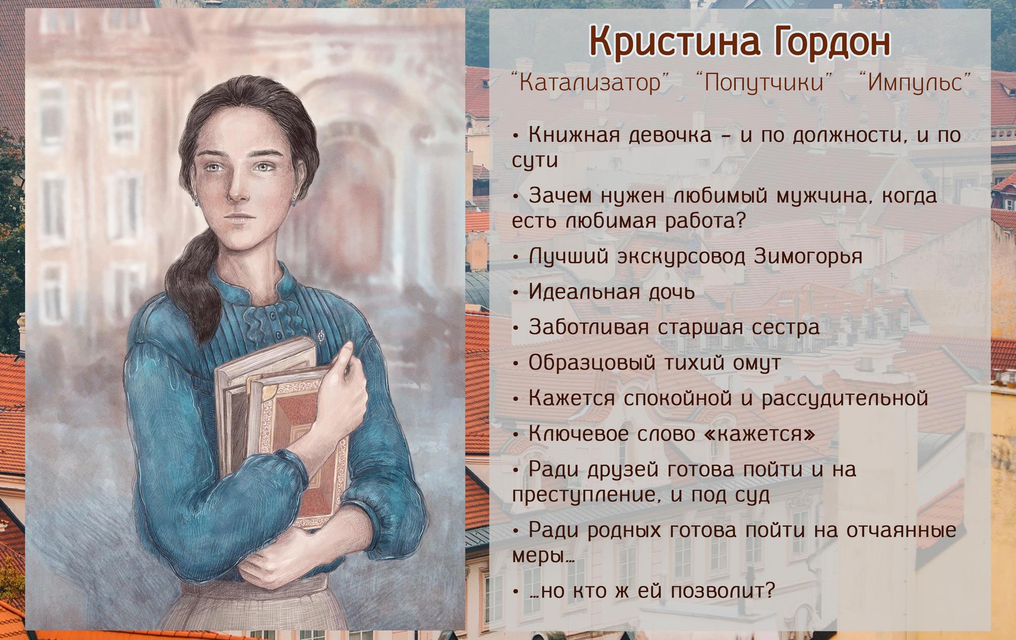 1. Кристина с детства знала, кем хочет стать, когда вырастет. Она мечтала работать в Зимогорском замке – главном музее её родного города. Там она сейчас и работает – старшим научным сотрудником книжного фонда и экскурсоводом. Причём экскурсии она проводит не только в самом музее, но и по всему Зимогорью. Она искренне влюблена в свой город и в свою работу. А потому острее многих переживает события, которые разрушают уютную атмосферу Зимогорья и не лучшим образом сказываются на репутации музея.