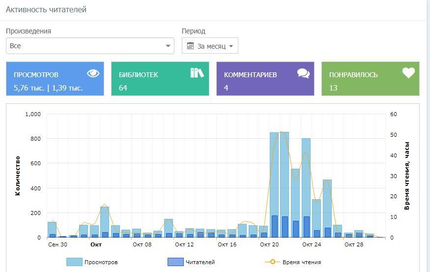 Как видите, кроме "Бабочки"1 было ещё 20 добавлений других моих книг в библиотеки, увеличились просмотры и после окончания действия теста ещё два дня интерес к моей странице был заметно выше обычного. Потом эффект ушёл.
