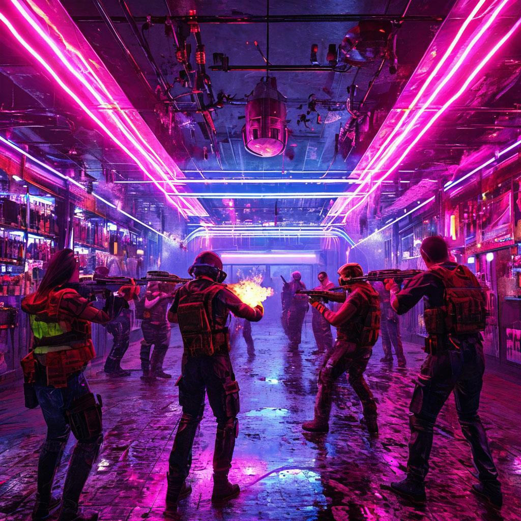 Тем временем стрельба приобрела еще больший масштаб. Десятки вооруженных мужчин поливали друг друга из пистолетов, пистолетов-пулеметов, дробовиков. Кажется, я еще слышал автомат Калашникова. Крики, пальба и оглушительная симфония воплей. А огни из стволов создавали новую цветовую гамму - совершенный полет смерти и свинцовой агонии. В такт все еще работающей светомузыке весь бой превращался в большую фантастическую галлюцинацию.