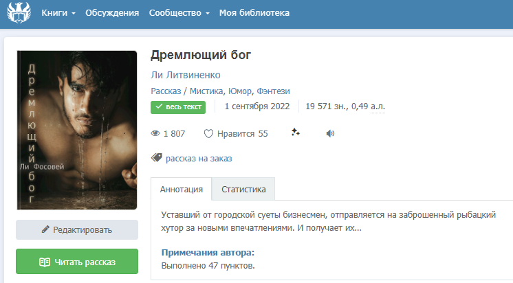 Автор: Ли ЛитвиненкоДрузья, мой рассказ озвучили! Недавно на АТ стартовал конкурс чтецов, я решила предложить для озвучки "Дремлющий бог". И вот случилось. Моя история нашла своего идеального чтеца. Замечательная, потрясающе талантливая Лидия Журавлева https://author.today/u/lidia1949 , подарила свой голос этой мистической истории. Очень советую послушать. Море положительных эмоций, это как слушать великую легенду. Сказочно, таинственно, захватывающе. Браво чтецу!