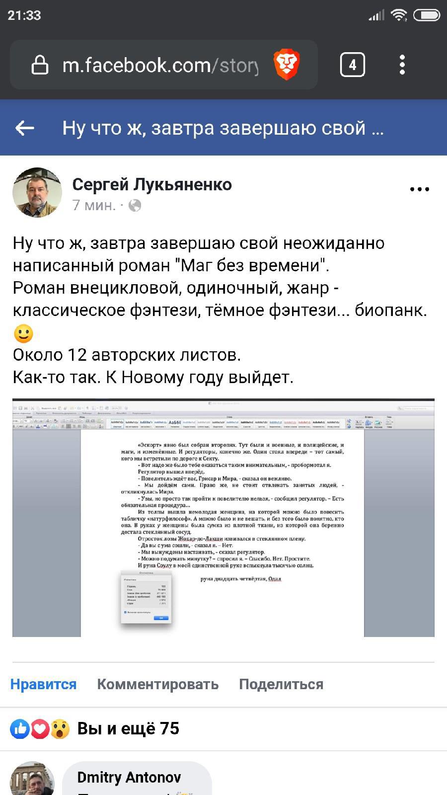 Для тех, кто не в курсе: Лукьяненко уже зарегистрировался на Автор.Тудей, затеяв эксперимент с романом под псевдонимом. Ну типа может ли неизвестный писатель относительно быстро подняться на электронной площадке. Вот этот пост в его Фейсбуке. Для тех, кому лень читать, привожу скрин результата эксперимента: