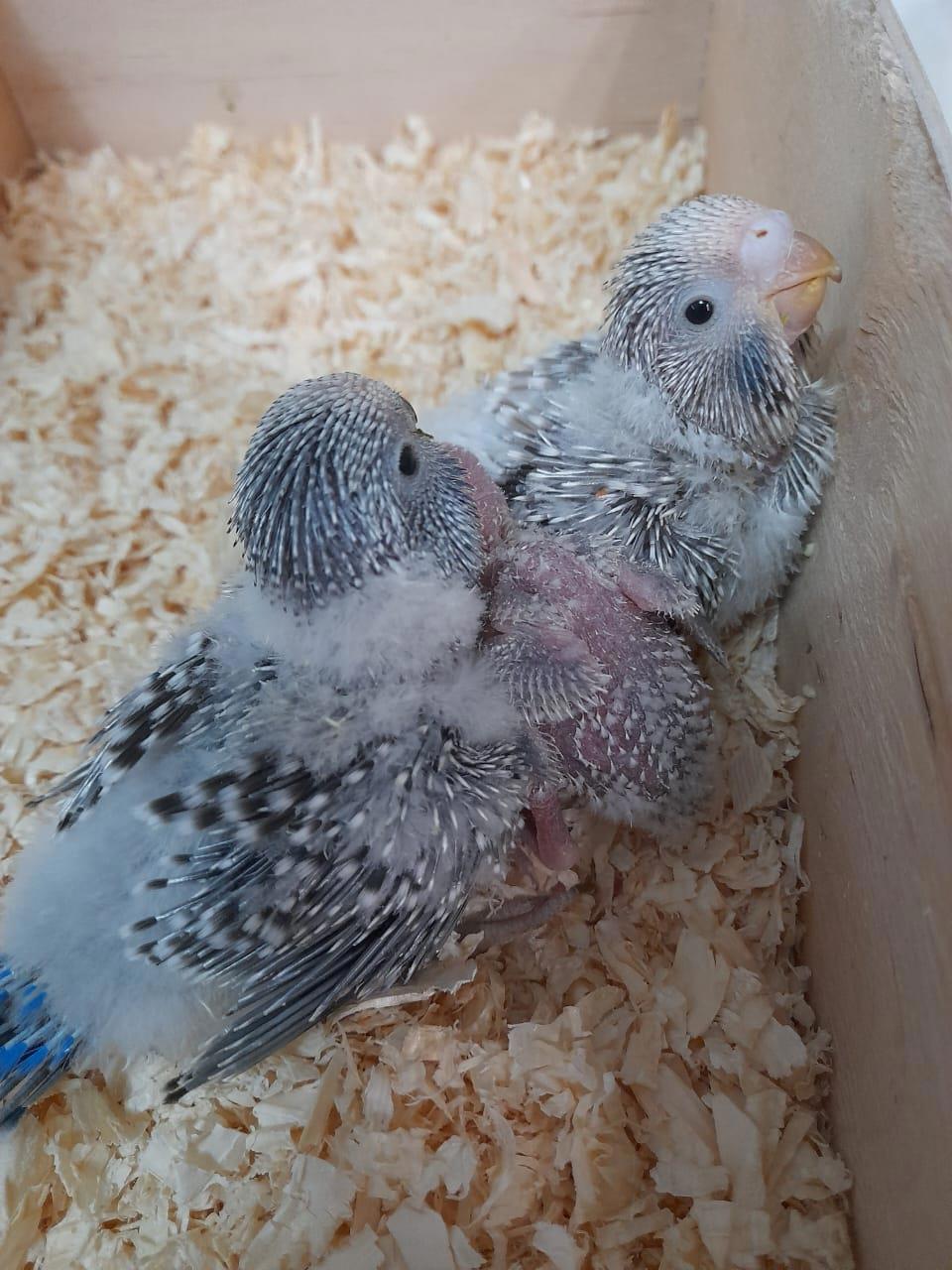 Тут старшие уже не дикобразы, а пуховички с кончиками синих (кобальтовых) перышек. Младшенький покрывается пухами, и "иголочки" обозначаются.