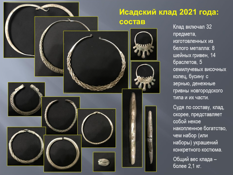 «…Специалисты из института археологии Российской академии наук сообщили о том, что найден богатый клад украшений, на этот раз рядом с городищем Старая Рязань. Археологи работали на том месте, где в 1237 год хан Батый уничтожил Рязань. Войска степняков обратили город в прах. Восстанавливать его было бессмысленно и Рязань отстроили заново, но в другом месте. Интересно то, что клад нашли не археологи и не на раскопках. Кто-то передал украшения и показал, где они были найдены. (…) В небольшом берестяном или лубяном туеске диаметром около 20-22 см лежало большое количество украшений из серебра, а также целая Новгородская гривна и ещё три части гривны. Среди предметов клада было 14 браслетов, 8 шейных гривен, 5 семилучевых височных колец и единственная бусина, покрытая зернью. Всего 32 предмета общим весом 2,1 кг. Ещё одним интересным фактом является то, что предметы клада датируется несколько более ранним временем, чем поселения вокруг Старой Рязани. То есть они были сокрыты в земле ещё до того, как возникла Старая Рязань и поселения неподалёку от неё. Предварительно, клад был спрятан в начале 12 века, а поселения возникли ближе к концу 12 века. Работа над кладовым комплексом ещё ведётся и возможно это даст новую информацию об истории Старой Рязани и её окрестностей.