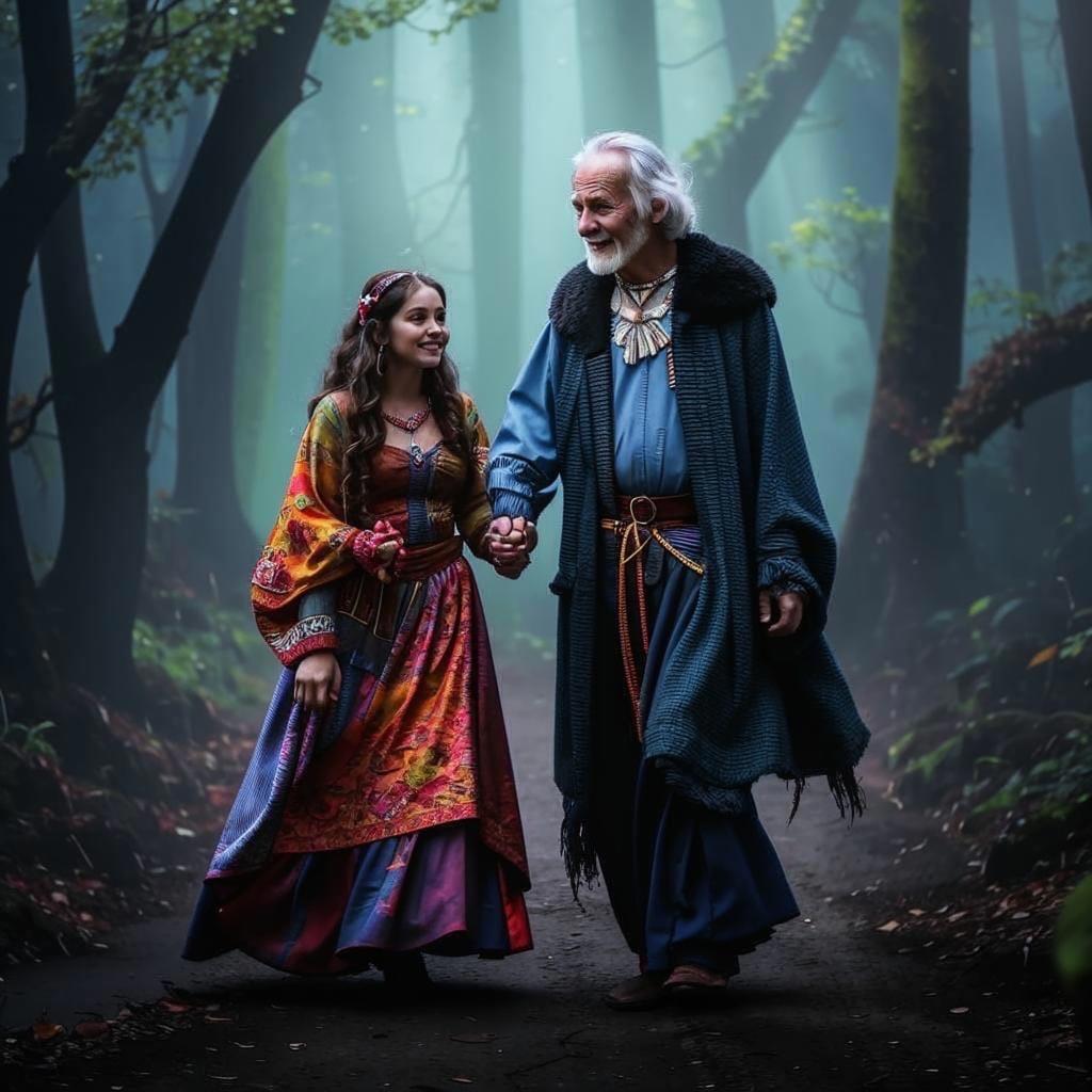 Все четверо, в напряжённой тишине ждали появления незнакомцев, и те не заставили себя долго ждать. Как и сказала Рыба, через десять минут на лесной тропинке показались двое. Невысокая молодая цыганка весело шагала рядом с улыбающимся стариком. Её красно-оранжевое одеяние развивалось на ветру, а от каждого шага, на её груди задорно звенели монисты. Седой мужчина с бородкой, в голубой рубашке и синей накидке, крепко держал за руку свою попутчицу и что-то увлечённо ей рассказывал. Рыжий крыс на плече старика уминал бублик за обе щёки и хихикал, вслушиваясь в их разговор.