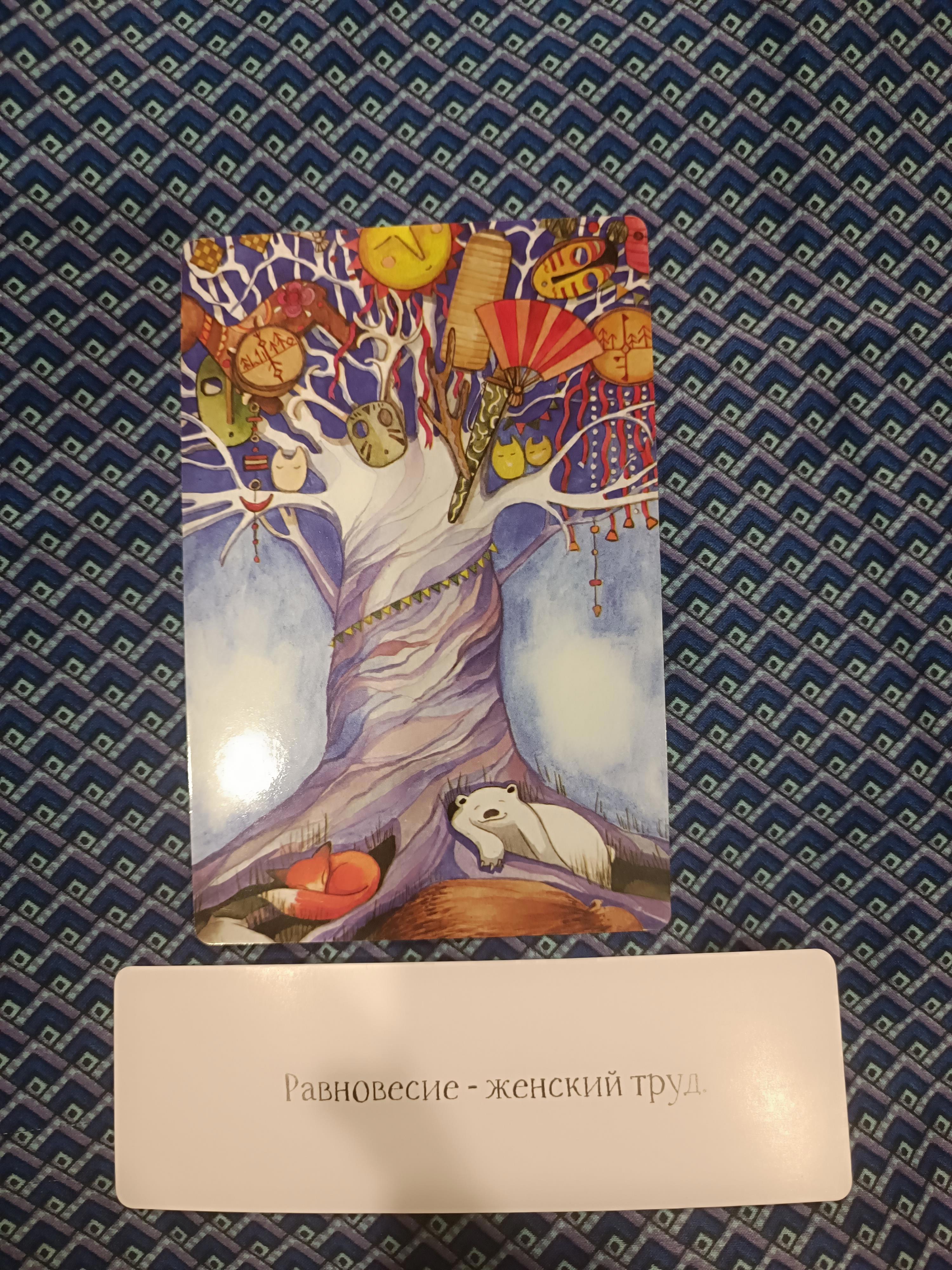 — Вам выпала карта, на которой изображено мощное дерево. Между его корней спит маленькая лисичка. Нос её прикрыт хвостом. Наверное, ей есть, что скрывать. Рядом лежит белый медведь. Кажется, что он спит, но на морде блуждает улыбка.