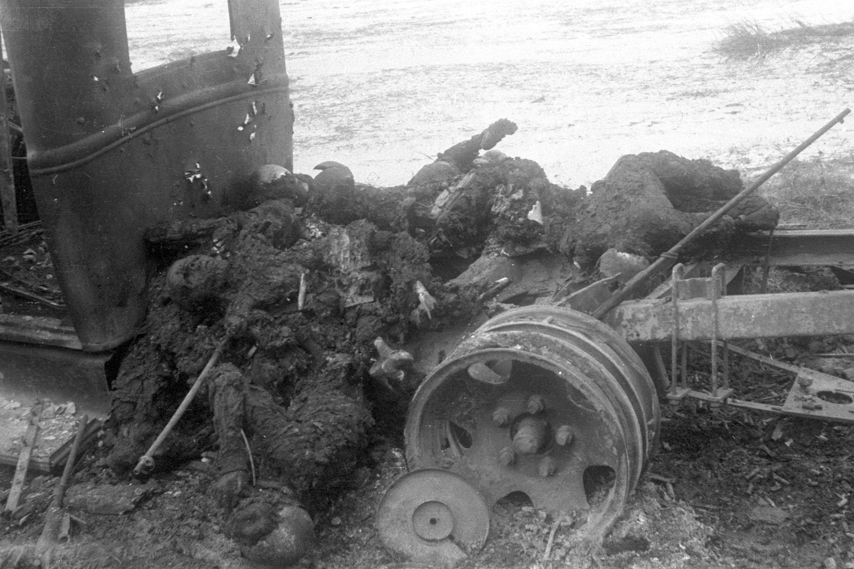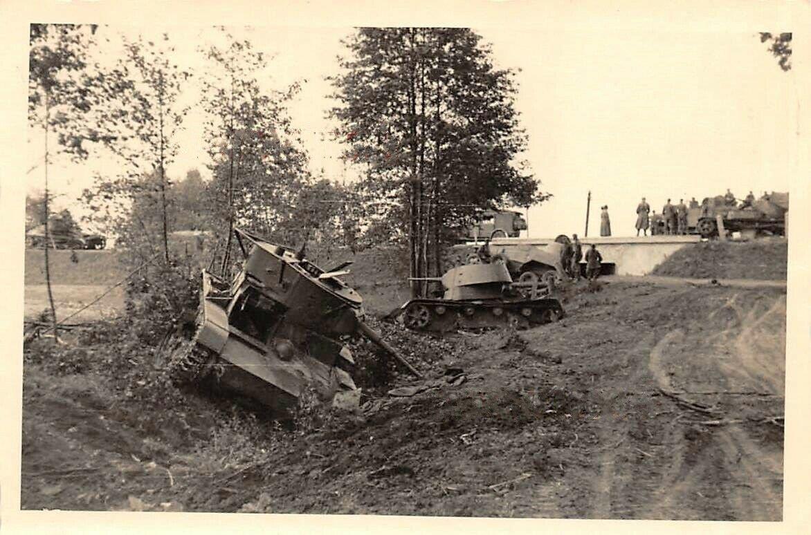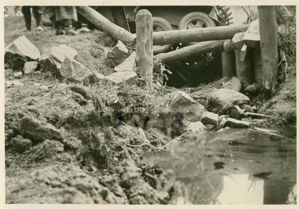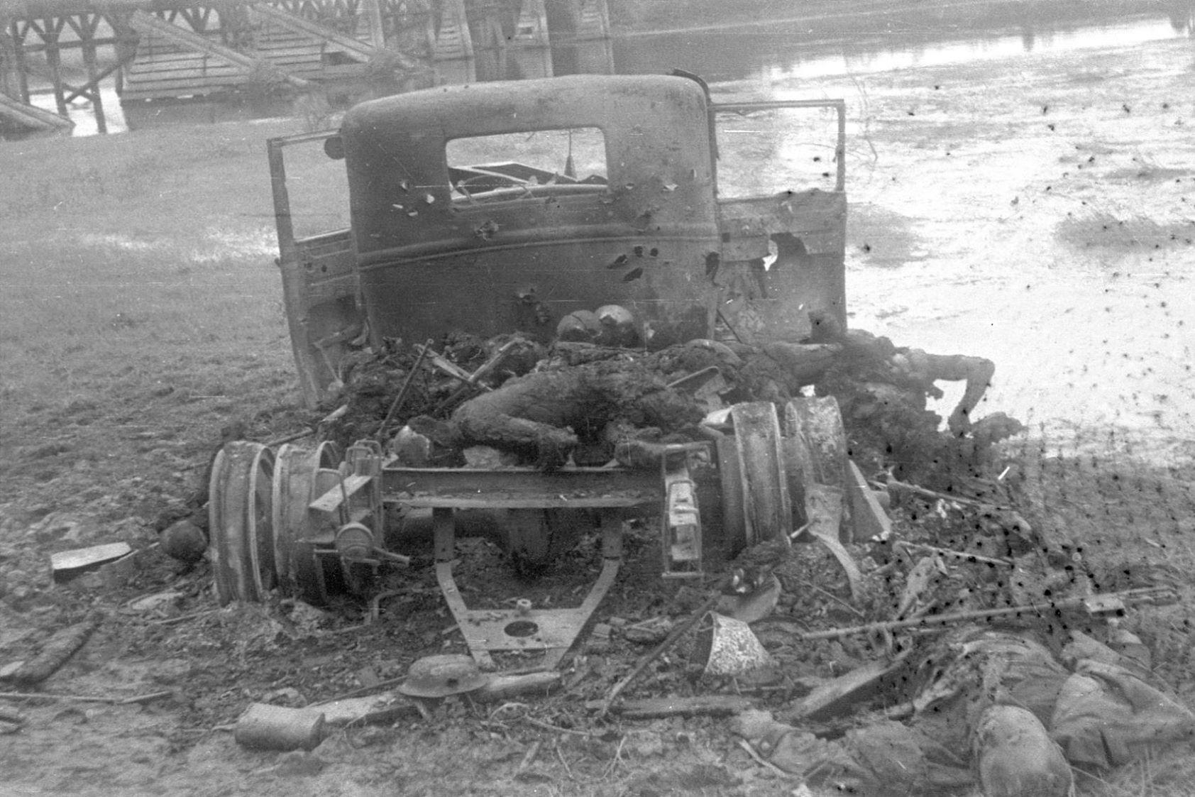 Мостик под тяжелым и неуклюжим бронеавтомобилем БА-10 провалился. Вытащить этот утюг было нечем. Экипаж похоже отстреливался из канавы. Пулемет ДТ рядом с погибшими.
