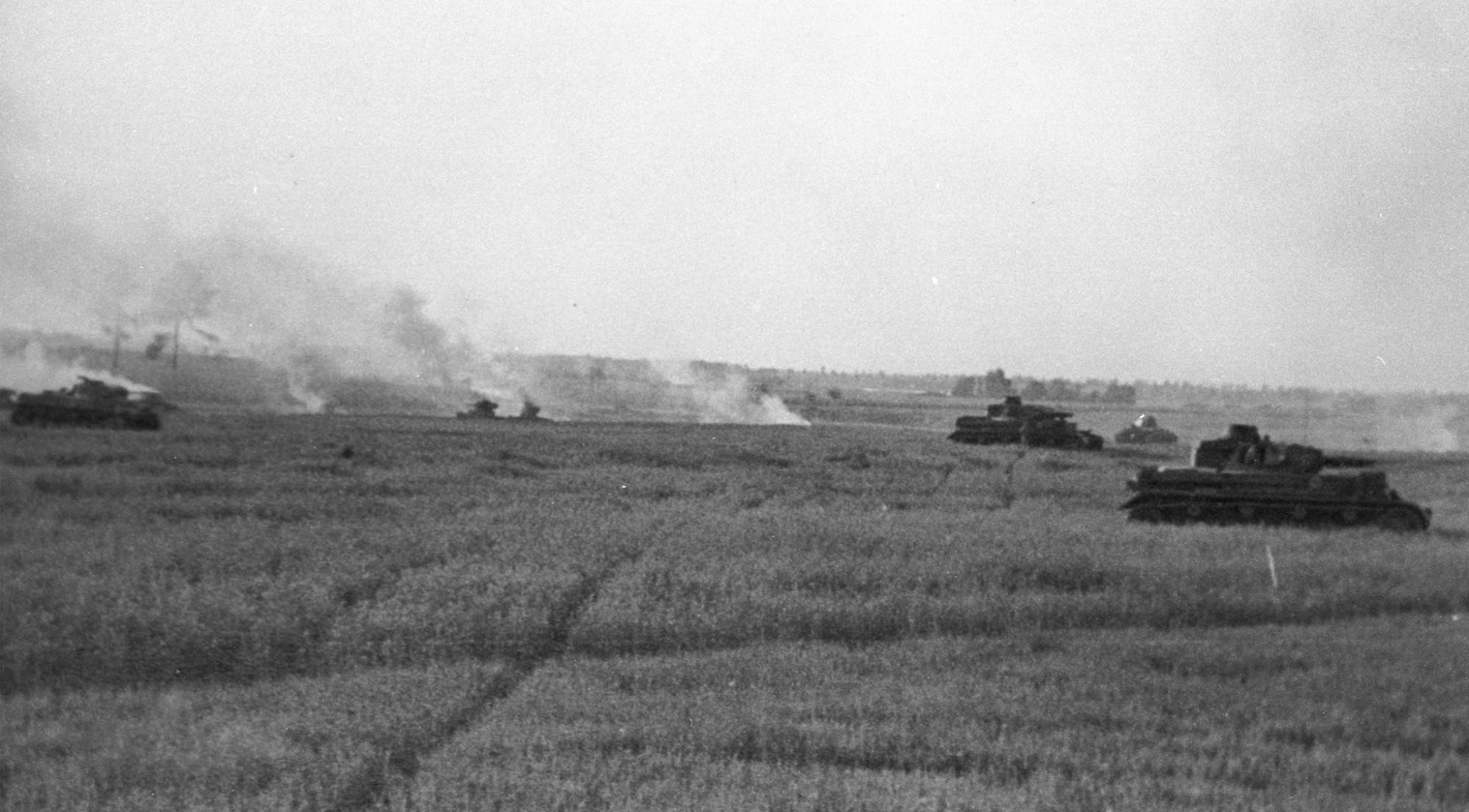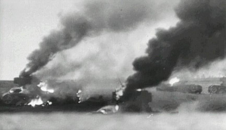 Горят машины. Снято если и не во время боя - то сразу после. И точка съемки высоко расположена - словно из башни танка снимают.