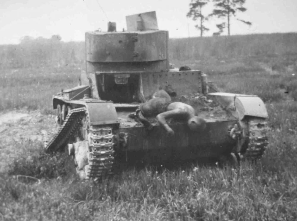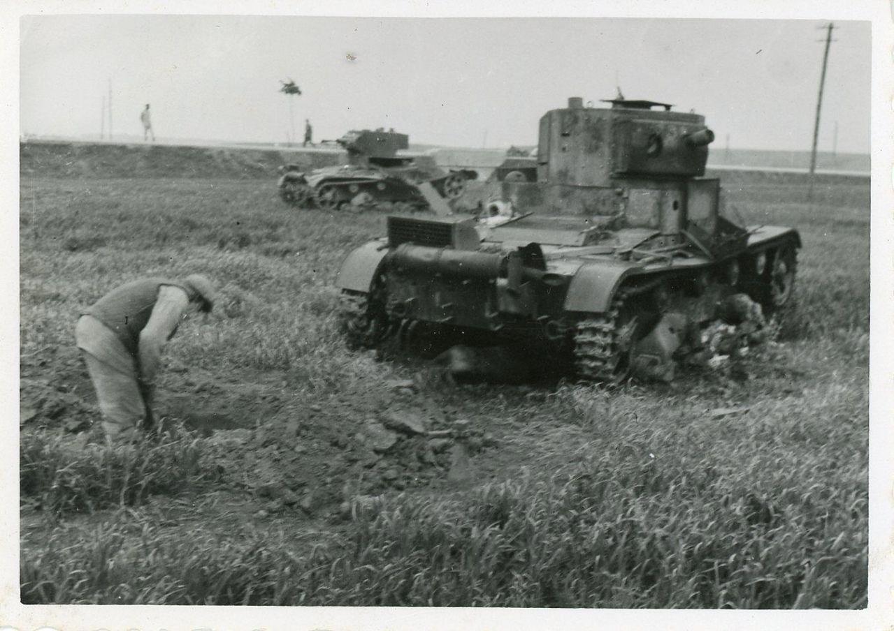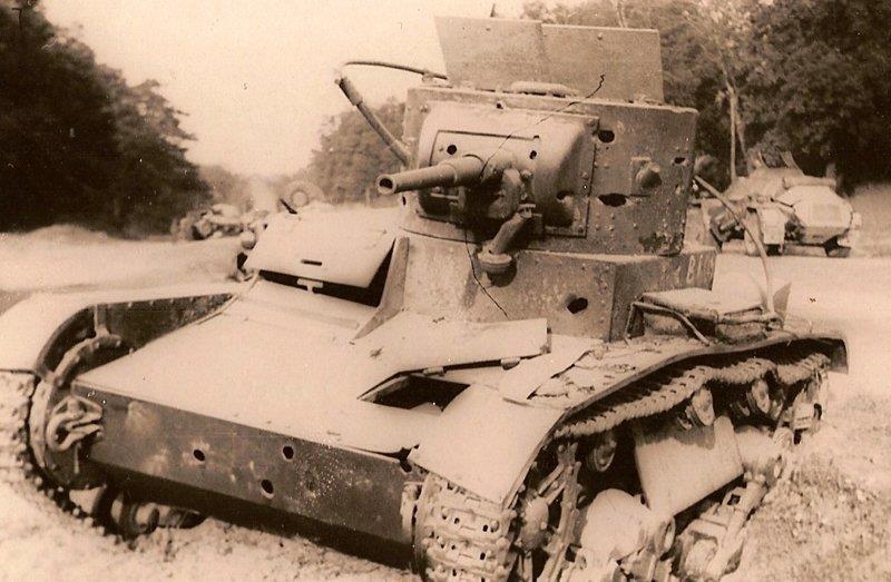 Т-26 - как у героев произведения. Но этому танку и его экипажу не повезло. Вперемешку пробоины от, по-моему 37 (или 50), и 20 мм. снарядов.