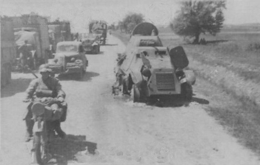 Сгоревший БА-11. И колонна австрийских войск - там оперировала и пехотная дивизия из Австрии.