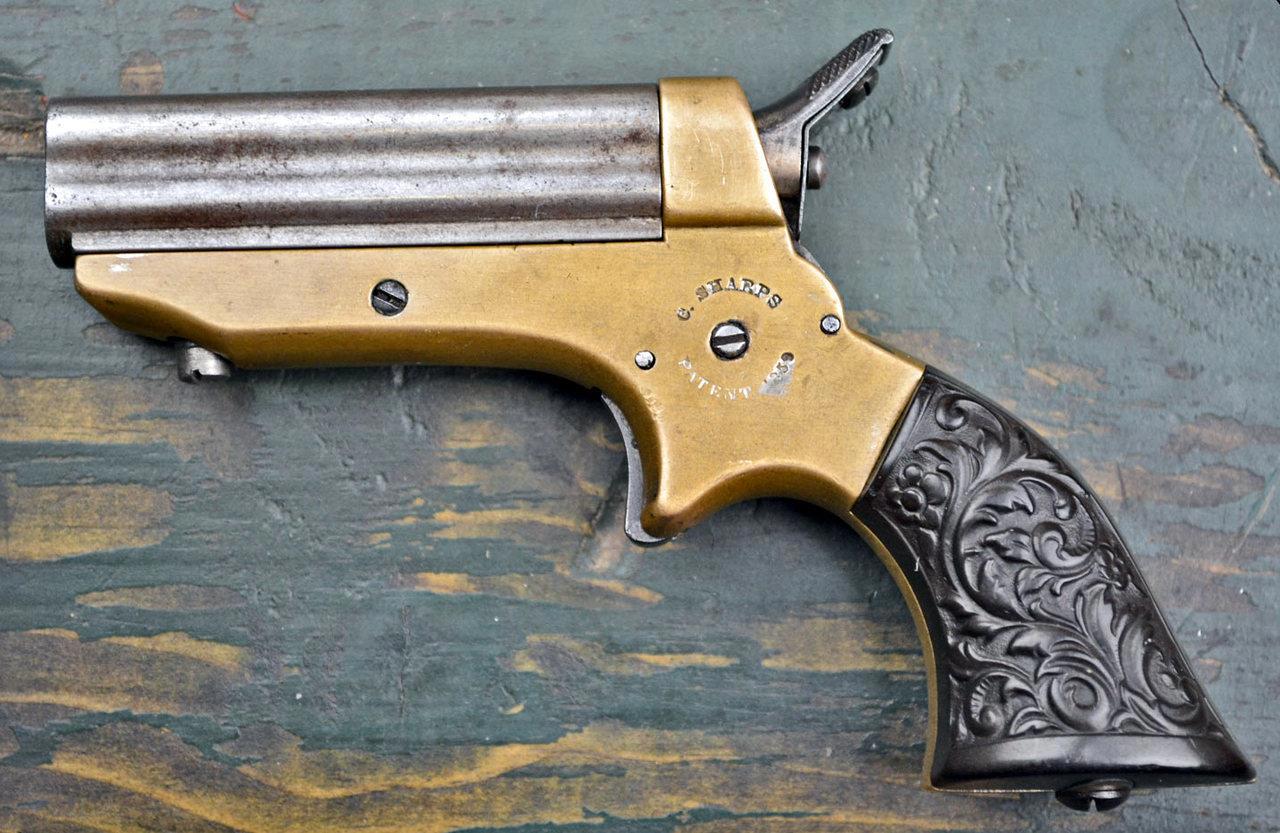 Но всё же один выстрел, одна попытка… этого мало. А вдруг – осечка?! Да – как-то не очень надёжно. Но оружейники это тоже предусмотрели. Ещё один производитель, который уделил оружию этого типа серьёзное внимание и был успешен возможно именно благодаря этому. Понятно, что патронов слишком много не бывает, поэтому у этого производителя был четырёхствольный вариант. Вот такой «Sharps Derringer»: