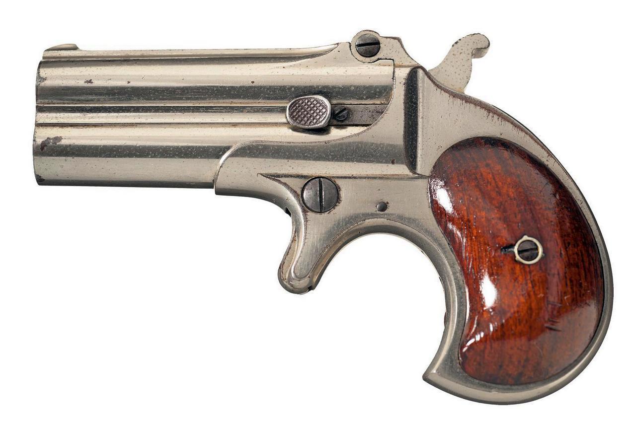 Много внимания этому типу пистолетов уделил такой оружейный монстр, как «Ремингтон». Вот этот маленький симпатяга, наверное, самый популярный из их «дерринджеров», выпущенных «Ремингтоном». Двуствольный «Remington .22 Model 95» калибра 5,6 мм: