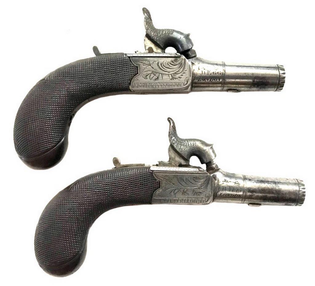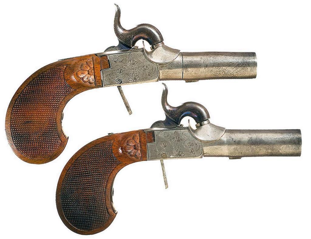 И вообще-то считать конструктора из Филадельфии Деринджера родоначальником этого типа оружия грешно. Потому что в Европе и Англии такие капсюльные, а до них ещё и кремнёвые пистолетики выпускались в товарных количествах. И проблему надёжности тоже решили сразу же. Но не путём изготовления многоствольных пистолетов, а просто продавая их парами. Их и сейчас на аукционах так же продают. Вот фотка с аукциона: