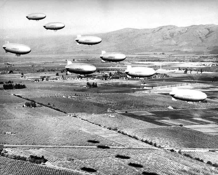 дирижабли ВМС США, несшие службу противолодочного патрулирования на аэродроме Моффетт, пролетали над военно-морской авиабазой в районе залива Сан-Франциско 11.02.1944 года, когда их и запечатлели.