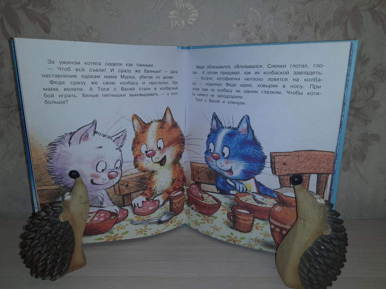 «На что ловятся котофеечки». Котята, которым скучно дома зимой, услышали про волшебных котофеечек, и решили их изловить. На колбаску они плохо ловятся, значит?.. Сразу скажу, метка «для дошкольного возраста» на книге не просто так. Очень милая серия сказок, но рассчитанная именно что на старший дошкольный возраст. Вот им будет просто идеально, тут именно сочетание прекрасных иллюстраций с очень хорошим языком детских сказок. С одной стороны очень сочно и образно, но при этом написано легко и просто, без лишних вычурных оборотов и заумных книжных выражений, которыми увы страдают многие детские писатели сегодня. Лёгкая и приятная сказочка для дошкольников.