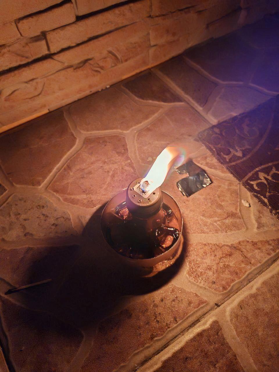 Лампа сделана слишком тяп-ляп (спешил). Из-за чего отверстия оказались слишком далеко от фитиля. Так что в будущем я, вероятно, повторю опыт более аутентично. Да и горючую жидкость надо проверить ту, которая описана в книге (смесь метилового спирта и скипидара), а не керосин, который пришлось применять, ибо он был под рукой. Заодно надо снять видео того как меняется не только интенсивность горения, но и освещение помещения.