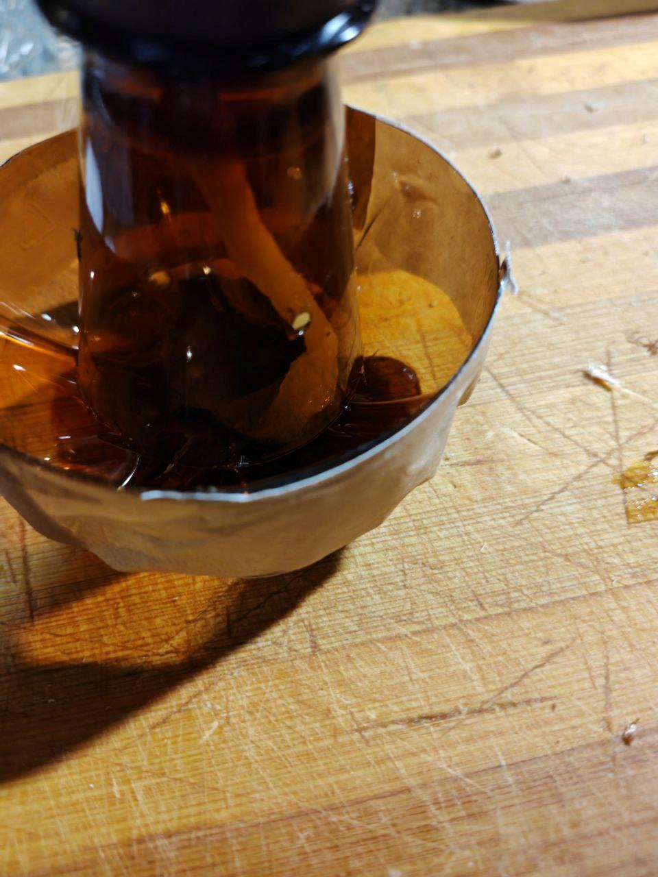 В центре пробки сделал отверстие, куда я воткнул фитиль, обернутый в небольшую втулку из фольги. Чтобы огонек не опускался ближе 3-4 мм к пробке. Вокруг фитиля – насверлил каскад маленьких отверстий. А в самом корпусе лампы просверлил несколько отверстий, через которые и будет засасываться воздух для наддува.