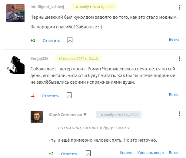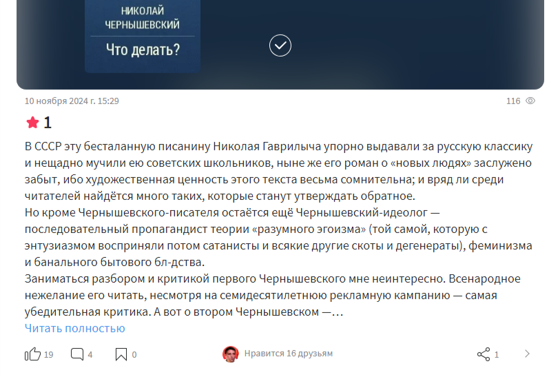 Автор: Юрий СимоненкоДанный текст я запостил в качестве рецензии на роман Н. Г. Чернышевского «Что делать» на сайте LiveLib 10 ноября. Судя по количеству лайков и нескольким комментариям, рецензия, что называется, зашла и могла бы стать весёлой комменторезкой. Но, уже через пару дней приток лайков и комментов остановился. Я тому не придал значения: ну, ладно, может ушла далеко в лентах у друзей моя рецензия… А вчера взял да и разлогинился. Зашёл к себе в профиль: нету про Черныша… Залогинился — появилась: