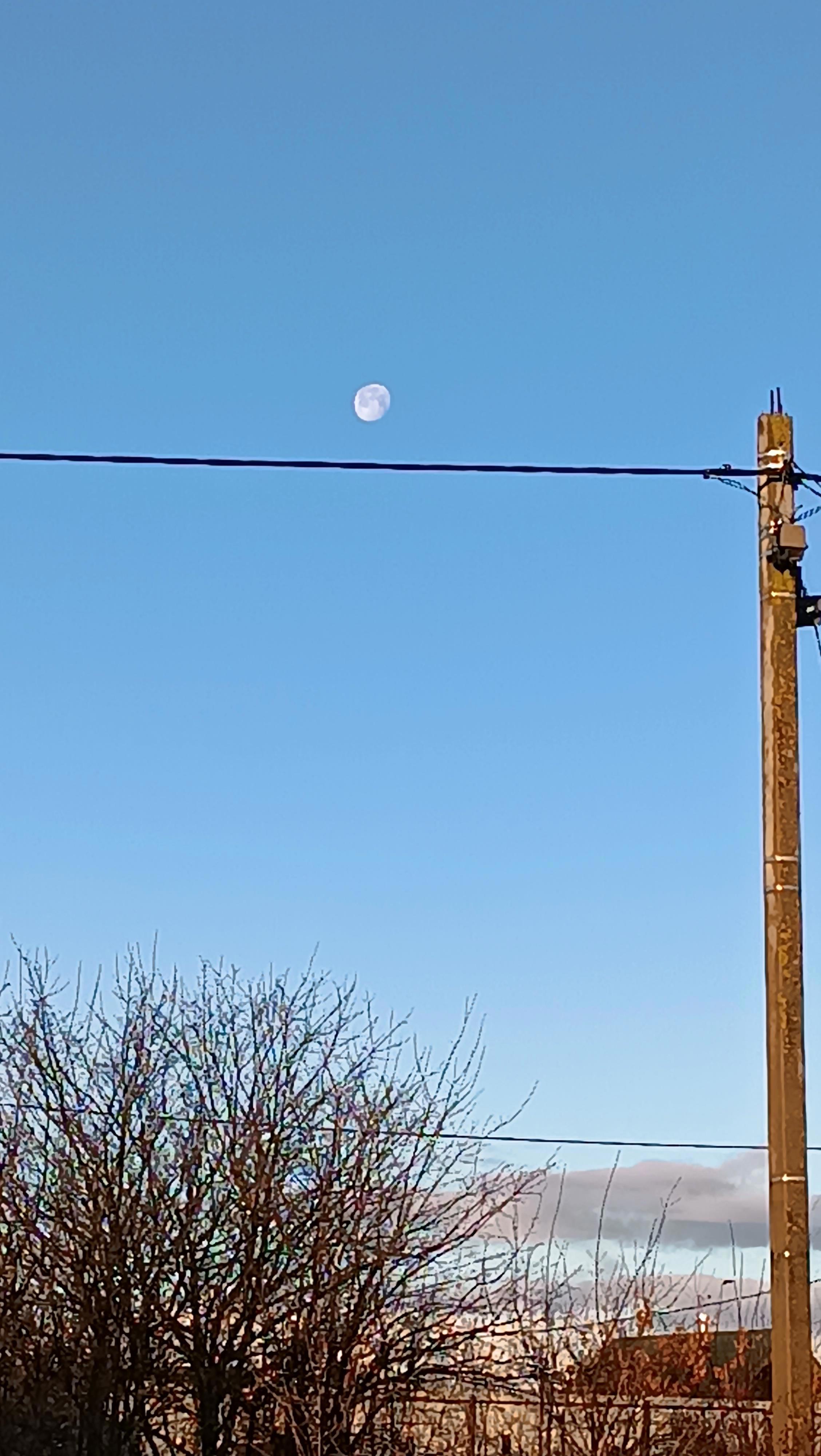 Примерно 10:30 утра, ясно, солнце светит, почти полная луна видна невооружённым глазом.