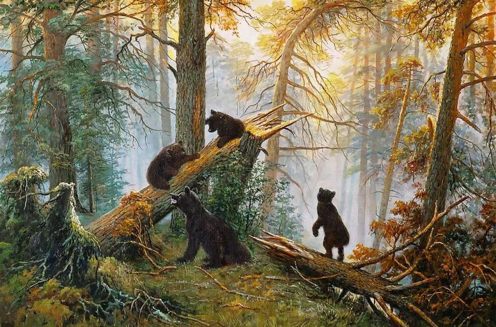 Константин Савицкий своей рукой дописывает медвежью семью, не касаясь пейзажа. А позже приезжает на выставку послушать, что будут говорить про его медведей, а так как художника мало кто знал в лицо, ему удается остаться незамеченным. Подойдя ближе, он увидел толпу людей перед картиной и страшно обрадовался, но когда услышал, что говорят, сильно разочаровался...