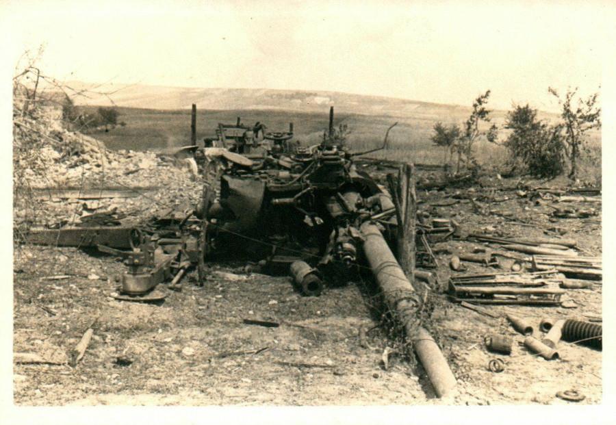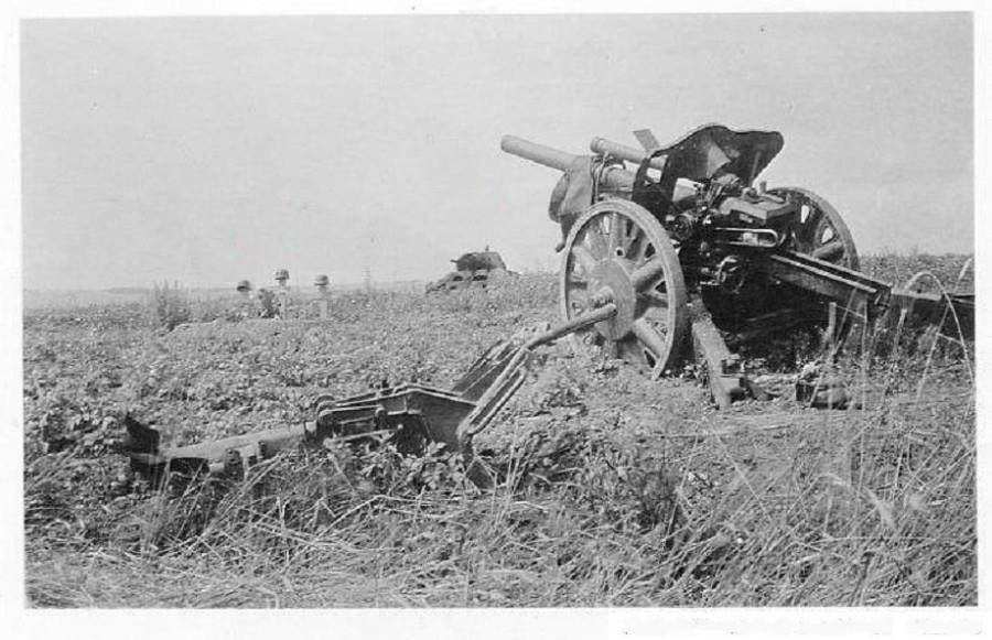 Уничтоженное вместе с расчетом 105 мм. орудие. Похоронены канониры рядом - видны слева кресты и каски. На заднем плане - сгоревшая Т-34.