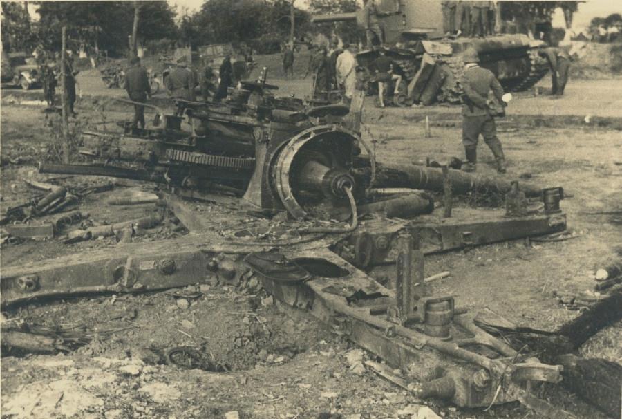 Вторая разбитая там же зенитка. Сзади подбитый КВ-2. Дистанция ведения огня внушает.