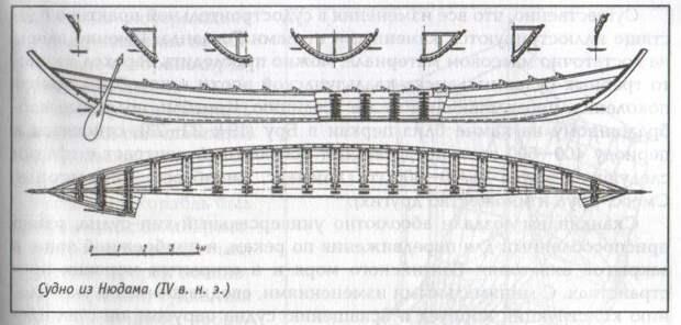Конечно, ко II в. до н.э. могли быть какие-то изменения в строении корабля, но если они были, то скорее незначительные, ибо в I в. н.э. Тацит описывает корабли германцев именно таким образом. Следующая по древности ладья была обнаружена в Нюдаме и датируется IV в. н.э.