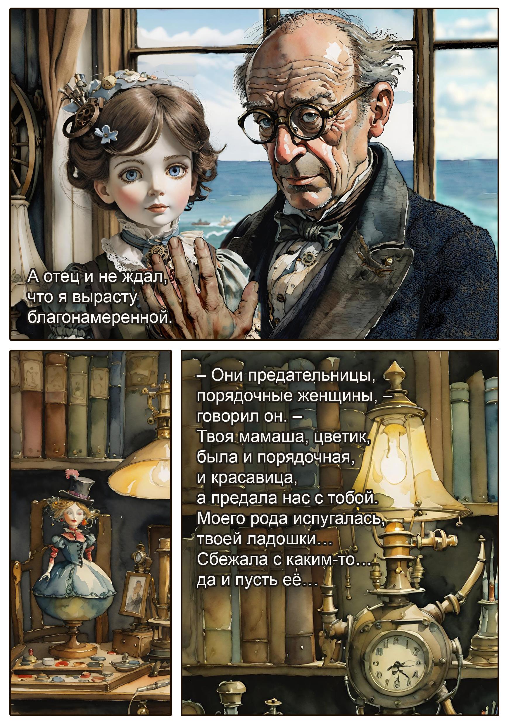 Озвучка спорная. Но ничего не можем поделать пока: озвучка, которую делает под музыку Суно, звучит лучше, чем любая нейросетевая начитка. Возможно, это слишком стилизовано - этакий мюзикл в духе советской экранизации "Трёх мушкетёров", где Констанция поёт: "Осторожно, милорд, ступеньки милорд!" - и слишком эмоционально, но лучше так, чем нудный голос робота. В общем, мы надеемся, что кому-то понравится - а те наши товарищи, кто любит текст читать, а не слушать, могут рассмотреть распечатку цитарта.