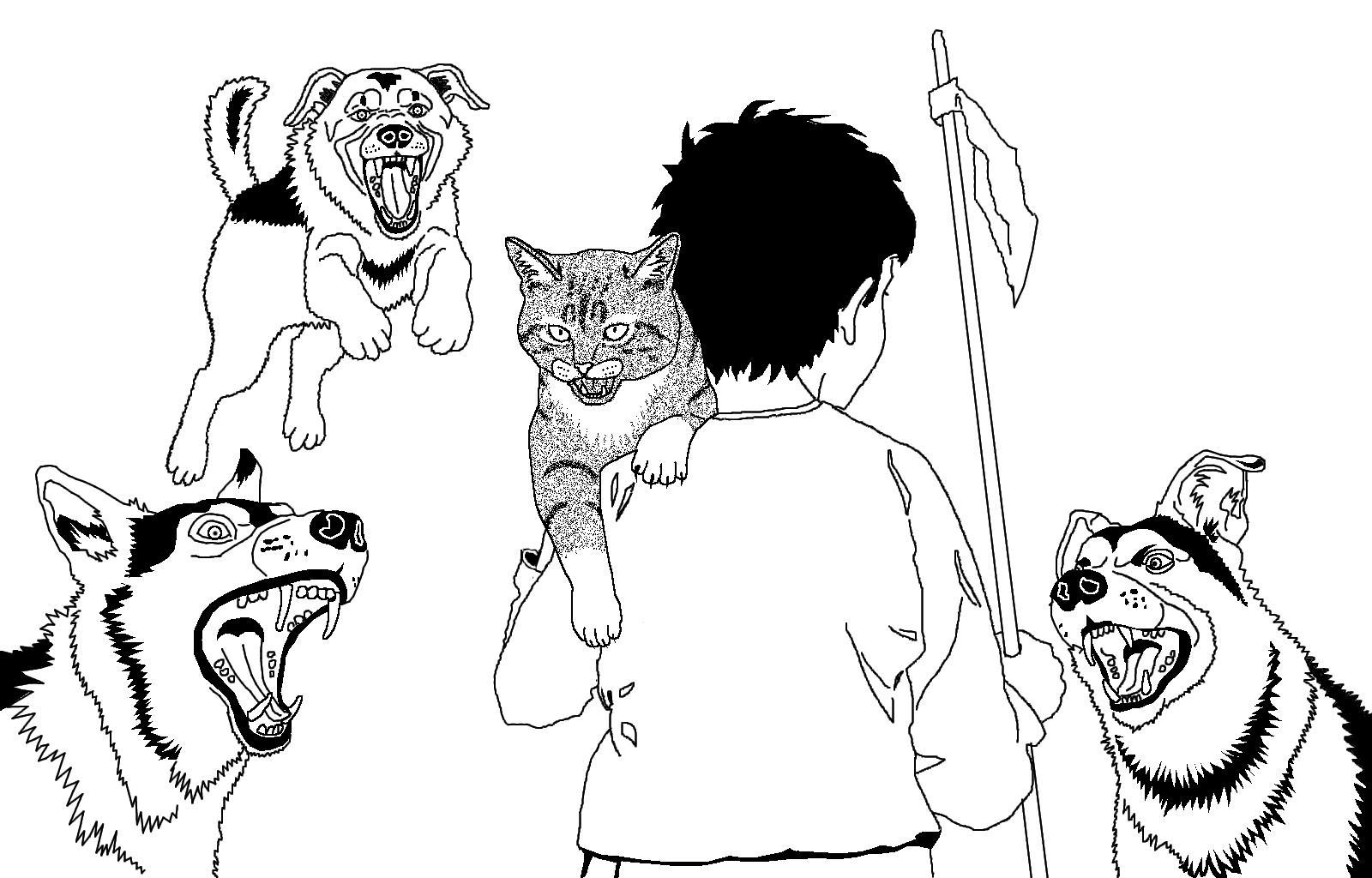 Псы учуяли его кровь, подскочили к нему с трех сторон, и один тут же вцепился ему в лодыжку. Иванушка покачнулся, но устоял на ногах. Сапог его был прочный, из свиной кожи, и песьи зубы его не прокусили. Зато кот в смертельном ужасе так вцепился в изгвазданную кровью рубашку, что Иванушке показалось, будто в него вонзилось с десяток рыболовных крючков.