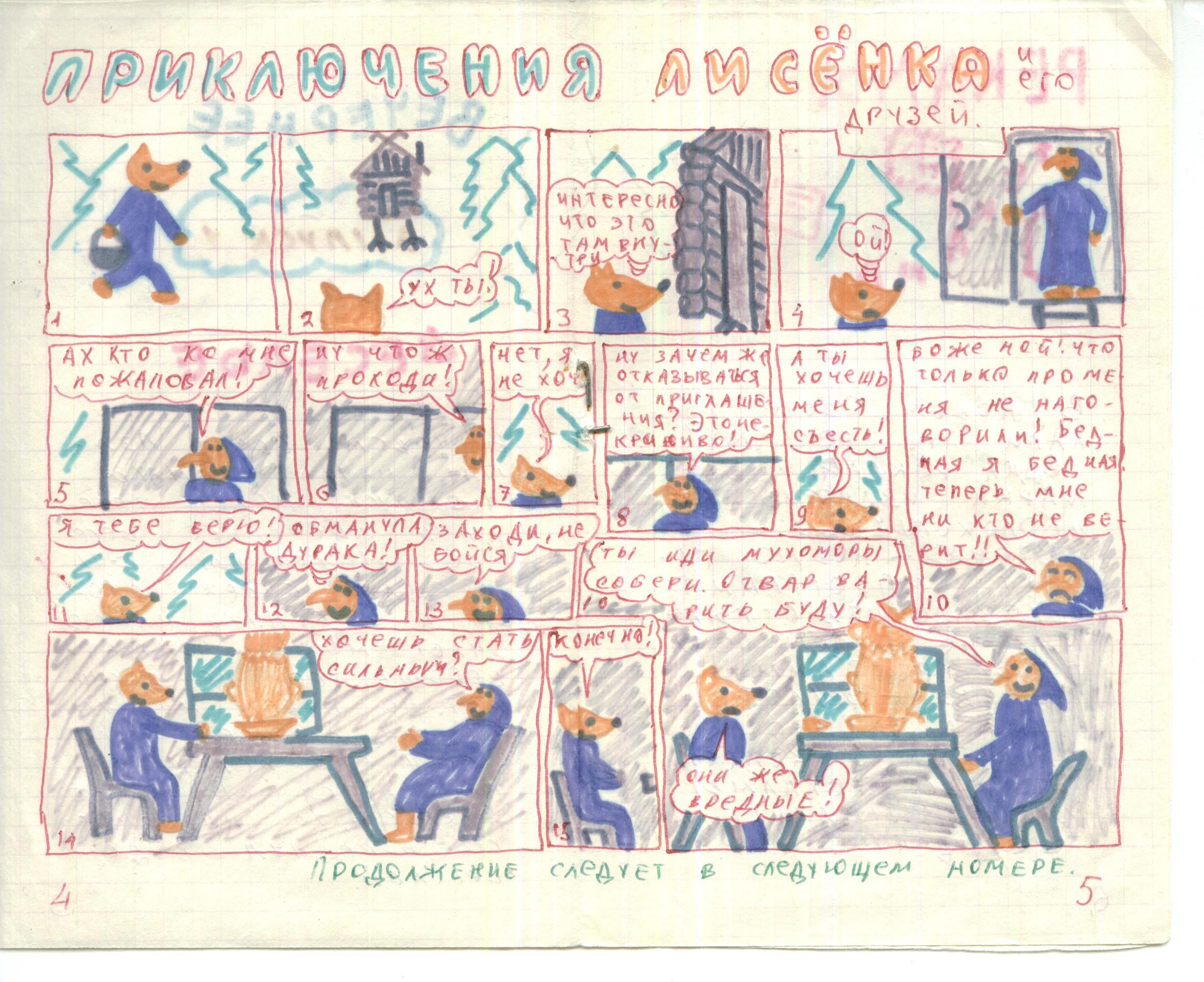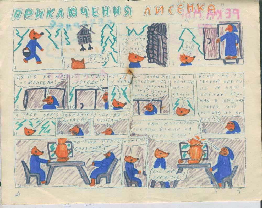 Но я не сдавался и попытался выпускать в 2 экземпляра свой журнал "Новости мультипликации". Основную часть я делал через копировку, а затем вручную раскрашивал оба экземпляра. Чудом сохранились оба экземпляра №6, 18 сентября 1989 года. Для примера показываю 4-5 страницы этого номера для сравнения, где я нарисовал комикс "Приключения Лисёнка".
