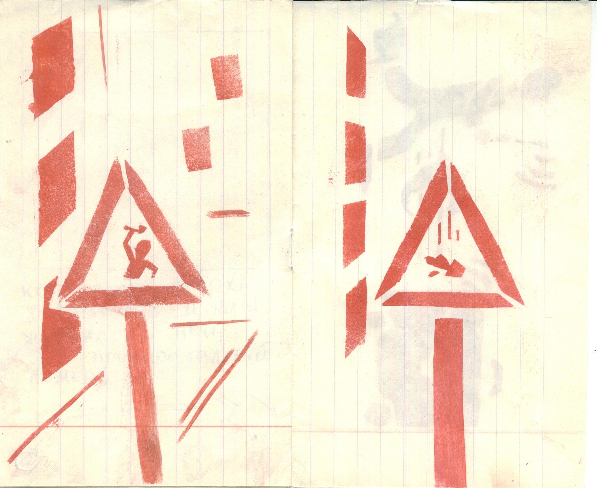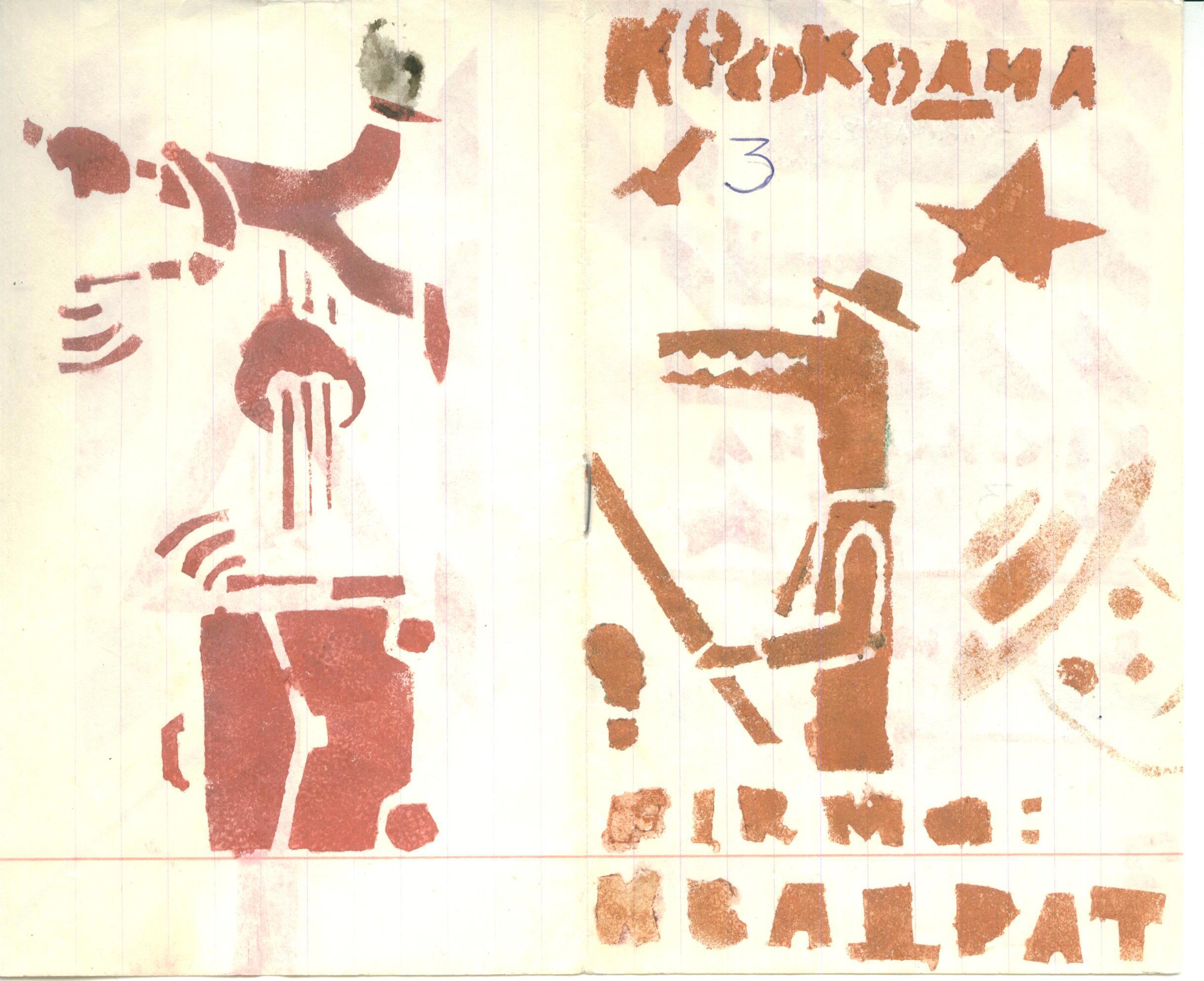 Тогда же я начал выпускать журнал "Крокодил", который целиком делался на самодельных трафаретах. Это, конечно, накладывало определённые ограничения на художественные возможности, но зато число экземпляров одного номера достигло 7 штук! Как ни странно, ни один из этих экземпляров не сохранился, сохранился только один номер.