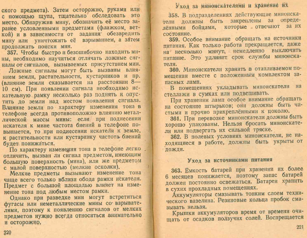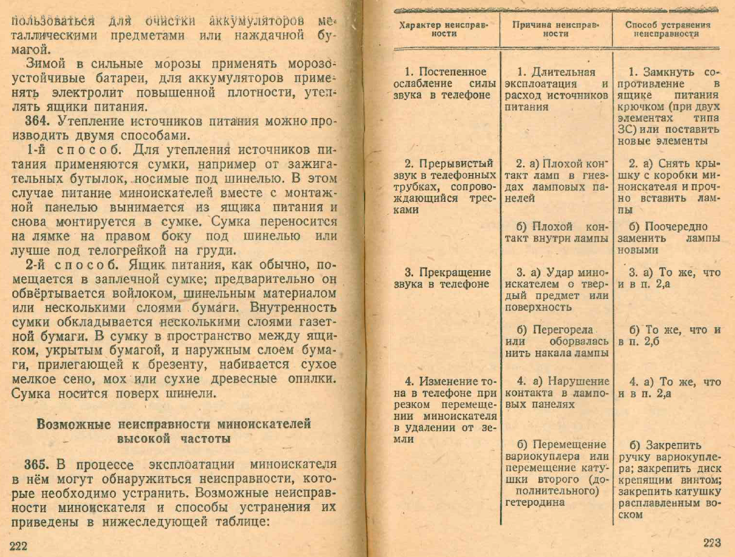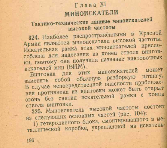 Автор: stidvagnПредлагаю ознакомиться с следующим отрывком из "Руководства по средствам минирования и разминирования", касающегося устройства и использования миноискателей. Отрывок приведён в более-менее приемлемый для чтения вид, т.к. в исходном документе некоторые таблицы и изображения приведены не поперек, а вдоль страниц.