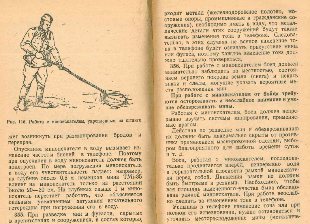 После прочтения данной инструкции я ещё лучше понял, почему немцы так выли от деревянных мин - хотя дело в общем-то простое. Сам взрыватель миноискатель обнаружить ещё может (хотя немцы в "Deutsche Landminen 1935-1945" писали, что их миноискатель взрыватели обнаруживать не мог в принципе - но давайте им подыграем и выдадим немецким сапёрам трофейные ВИМ-ы), пускай продуктивность поиска и будет снижена, но по характеру тона в наушниках он не будет отличаться от остальных мелких металлических предметов - осколков, пуль, и т.д. А их на поле боя - дофига и больше, и каждый ты не сможешь физически щупом обследовать. В итоге, деревянные мины могут быть сапёром с миноискателем просто проигнорированы - и ему очень повезёт, если это не будут противопехотные ПМД-6...