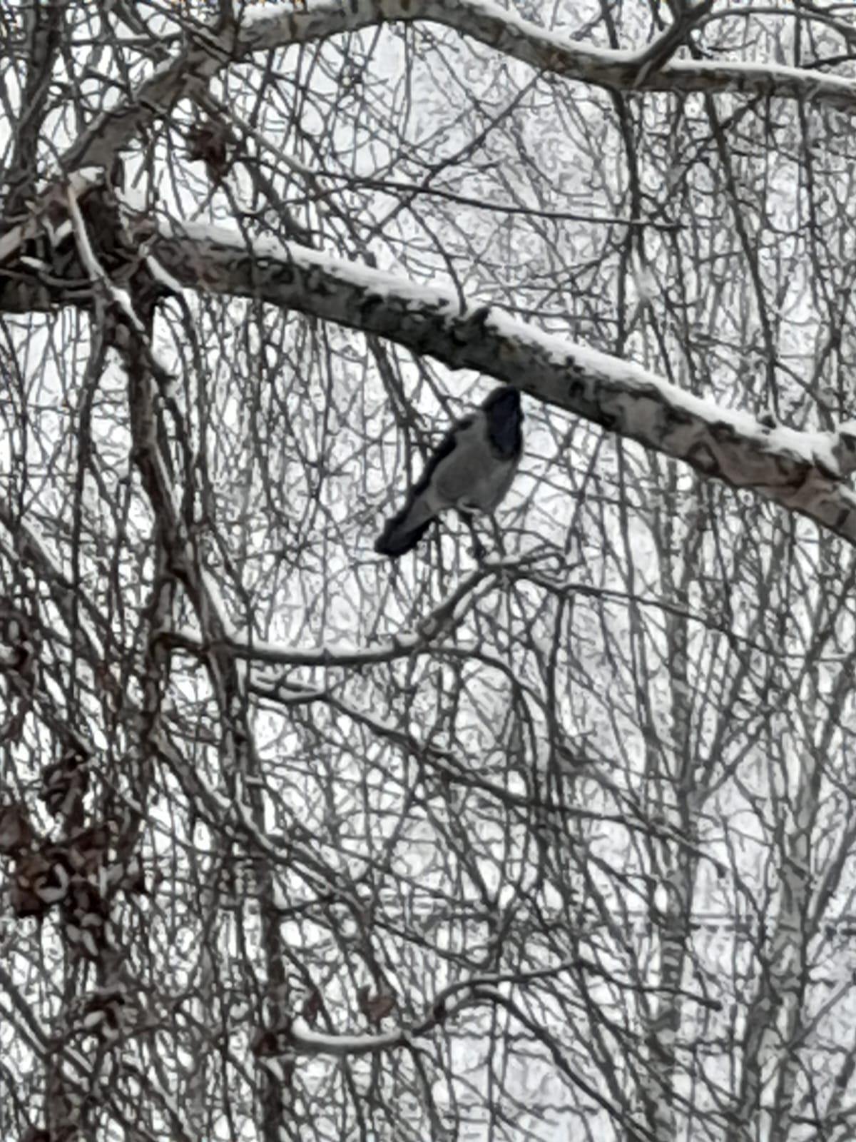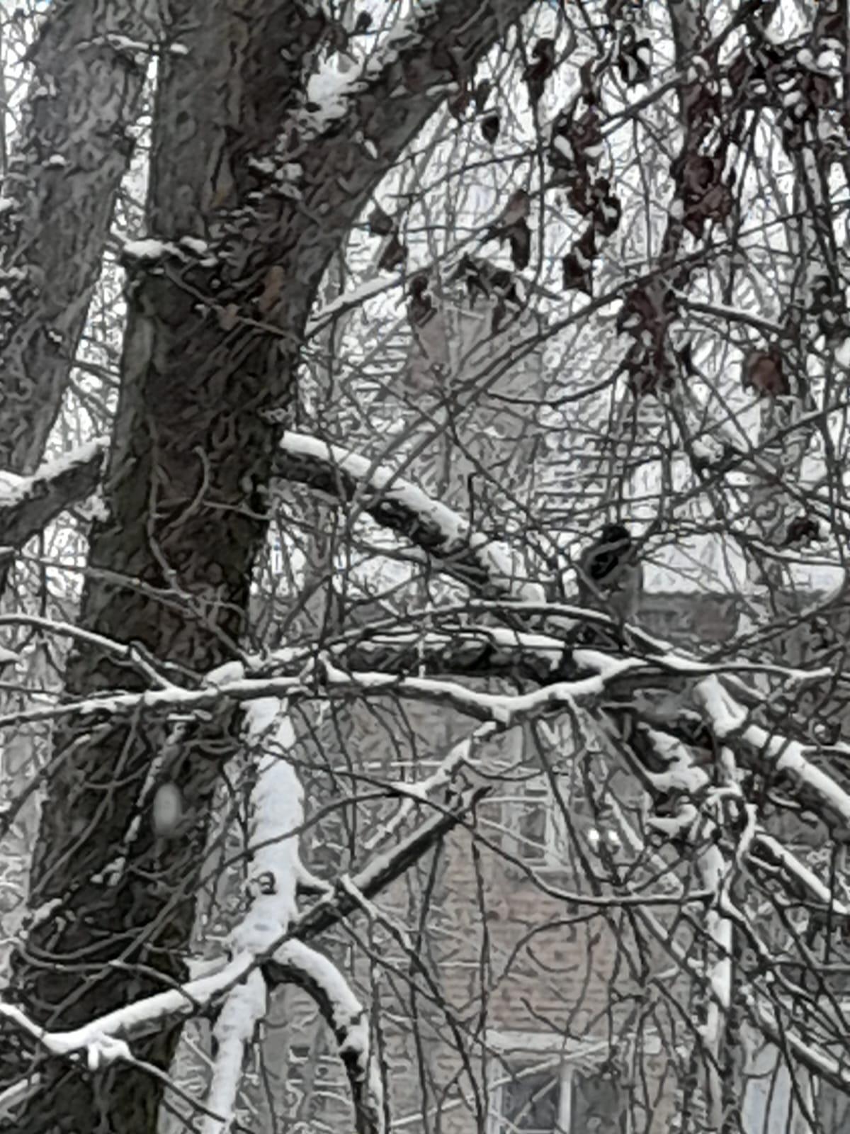 Какое-то время я недоумевала: почему та стая четко держится границы, прилетая только на поесть? Не сразу мне показались те, кто "держит" деревья на моей стороне. У меня окна прямо напротив ветвей, и я их, видимо, смущала мельтешением. Они больше держались дальней части дома (у меня крайний, последний подъезд). Но к зиме пищи стало меньше, и я их увидела.