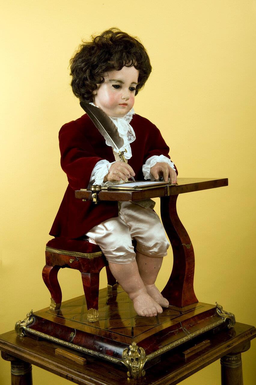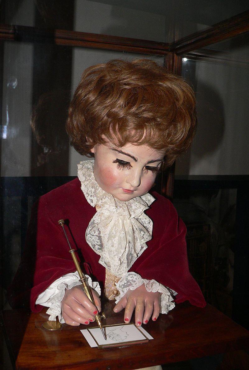 Работы Дро - пожалуй, вершина искусства механической игрушки. Даже если бы его создания ничего не умели, они ценились бы, как изумительного мастерства куклы. Но они еще и умеют! "Каллиграф", например, обмакивает перо в чернила, пишет несколько разных фраз до сорока знаков каждая (что-то вроде "Мастер Дро - мой создатель" или "Сегодня прекрасная погода"), промакивает написанное пресс-папье, задумчиво смотрит на лист бумаги, выбрасывает его и снова принимается выводить строки четким, красивым почерком. При этом его глаза следуют за строкой.