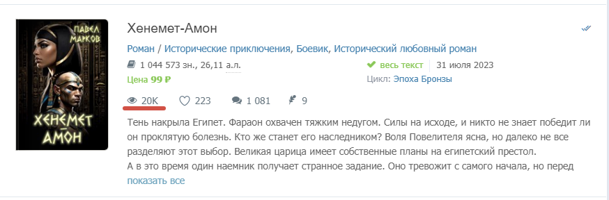 Автор: Павел МарковТут случайно увидел, что роман «Хенемет-Амон» достиг отметки в 20к просмотров, что безусловно приятно. И очень здорово наблюдать, как вторая книга цикла почти не уступает в плане статистики первой. Ну, может по библиотекам проигрывает, но это нормально.