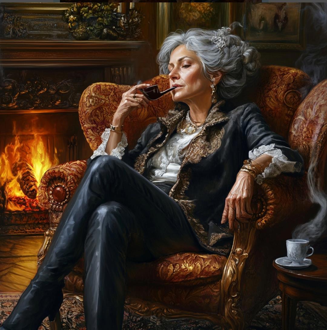 Седовласая женщина с курительной трубкой в руках усаживается в кресло.